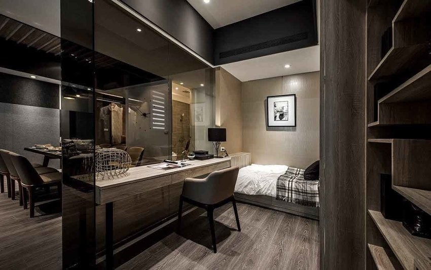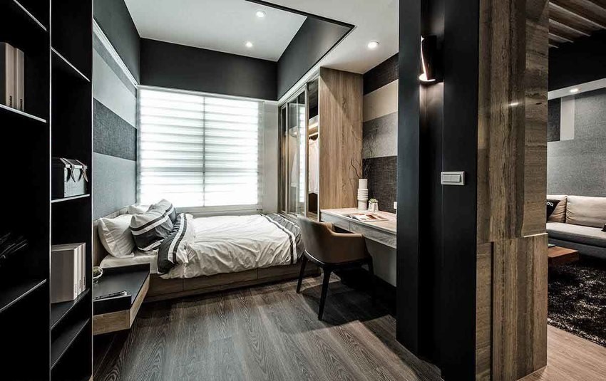 书房正对着的空间还有个次卧,这边是给孩子的卧室,和书房的设计是差不多的,充分利用空间打造出来的收纳柜,以及利用了和客厅的隔断墙做了一个梳妆台,非常的实用了。
