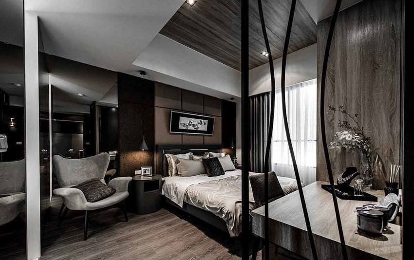 主卧室,空间非常大,而且整个色调的搭配很有主人的风格,比如床头墙的装饰和搭配,以及沙发靠背椅。再加上床尾正对着的梳妆台,整个实木的装饰设计更温馨,虽然色调比较沉,但是一点都不会觉得压抑,反而是一种高端低调的轻奢感。