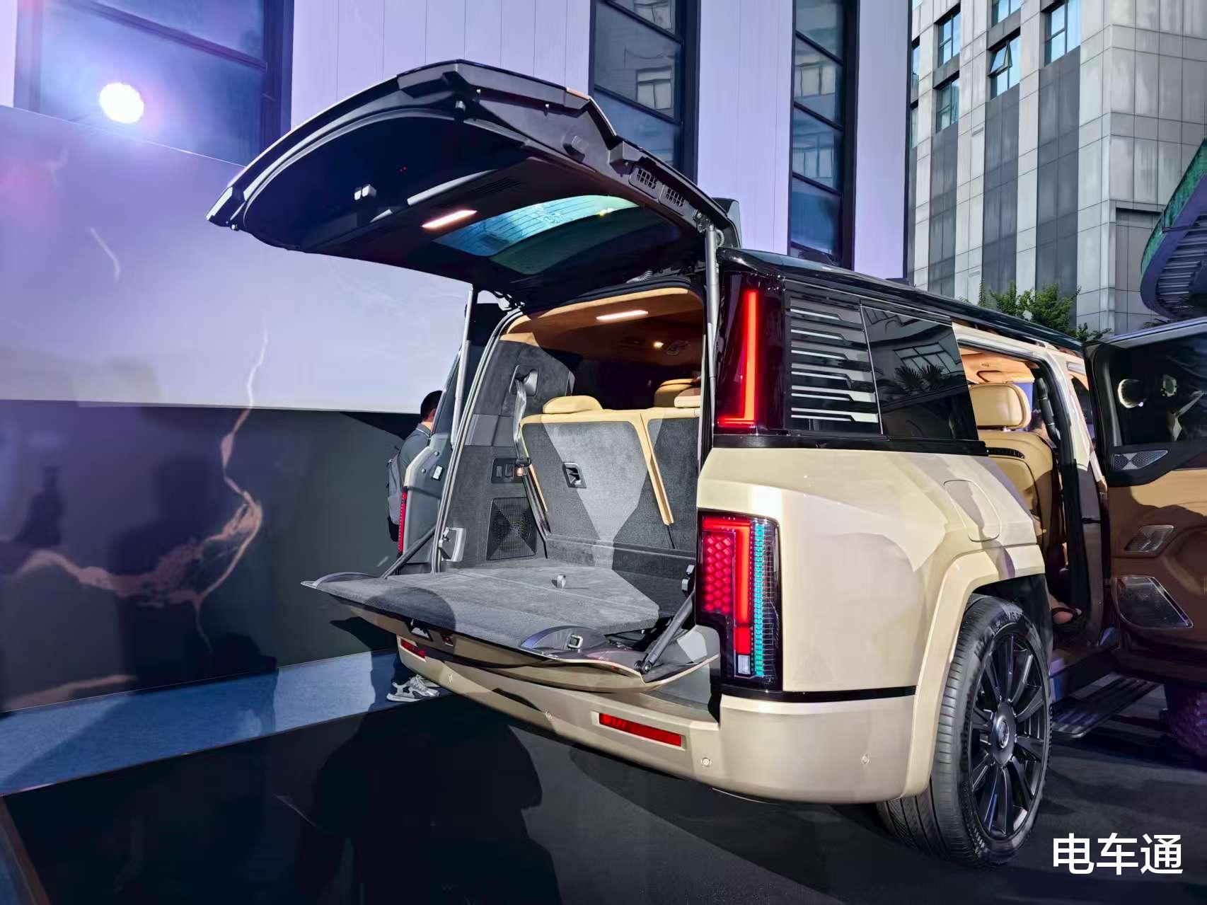 新车尾部没有配备仰望 U8 的备胎和备胎罩,而是采用了电动天地尾门设计。这样的设计可以让上尾门所占据的空间更小,下尾门的最大承重达 200kg,可以在露营时放置物品或者两个成年人直接坐在尾门上观景。
