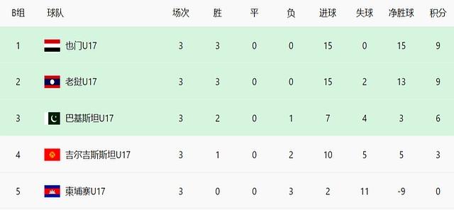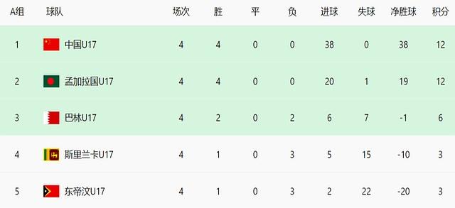 目前A组积分榜上,中国队和孟加拉国同积12分,但我们的净胜球优势巨大(38比19)。巴林、斯里兰卡、东帝汶和文莱已经提前出局,最后一轮中国队只要战平孟加拉国就能锁定小组头名,晋级明年在沙特举行的U17亚洲杯正赛。