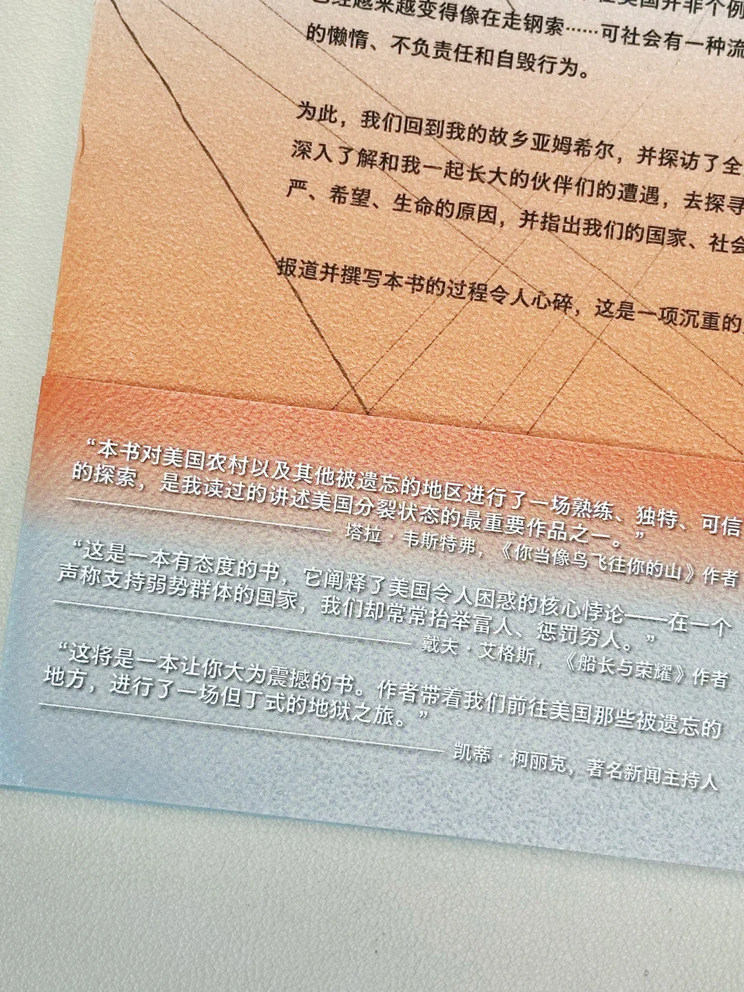 为此,作者回到了故乡亚姆希尔,并探访了全国50个州和1个特区,去深入了解这群伙伴们的遭遇,去探寻数千万人经历失去工作、尊严、希望、生命的原因,并指出当下的我们如何才能做得更好。