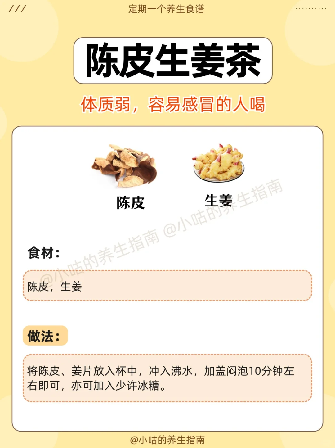 欢迎来到小咕的健康指南! 上期给大家带来了《冬瓜的8种搭配》 这期就给大家带来《陈皮的9种搭配》 - 立秋时节应该以清肺祛湿、滋阴润肺为主 首选自然是陈皮! 给大家推荐陈皮的9种搭配! - 陈皮山楂水 陈皮胎菊水 陈皮玫瑰花水 陈皮枸杞水 陈皮罗汉果 陈皮普洱茶 陈皮蜂蜜水 陈皮生姜茶 陈皮柠檬水 - 有需要的可以先收藏起来哦 快和我一起健康养生吧!