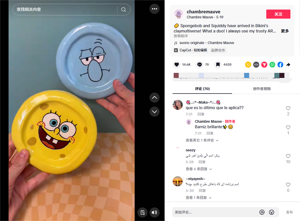 比如与达人@Chambre Mauve合作,用黏土做出海绵宝宝造型的盘子,既吸引了动漫迷,又渗透了手作圈,实现了跨圈层传播。