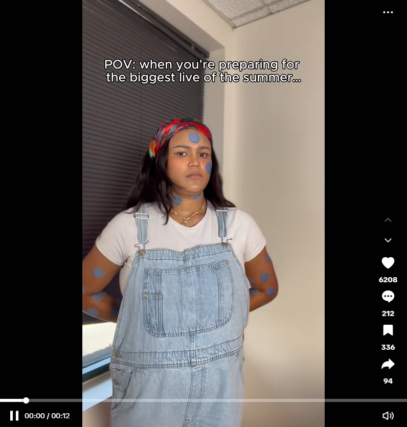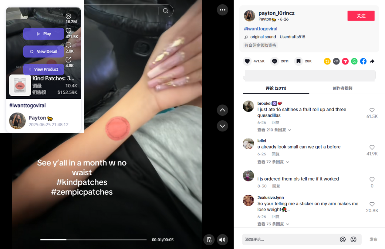 在TikTok上,他们深谙“3秒定生死”的法则。视频开头常常是反常识的视觉画面——比如把贴片贴满全身,配上“当你为夏天最火的直播做准备时……”的文案。