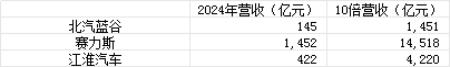 从营收成长倍数来判断,赛力斯和江淮汽车确实不如北汽蓝谷。
