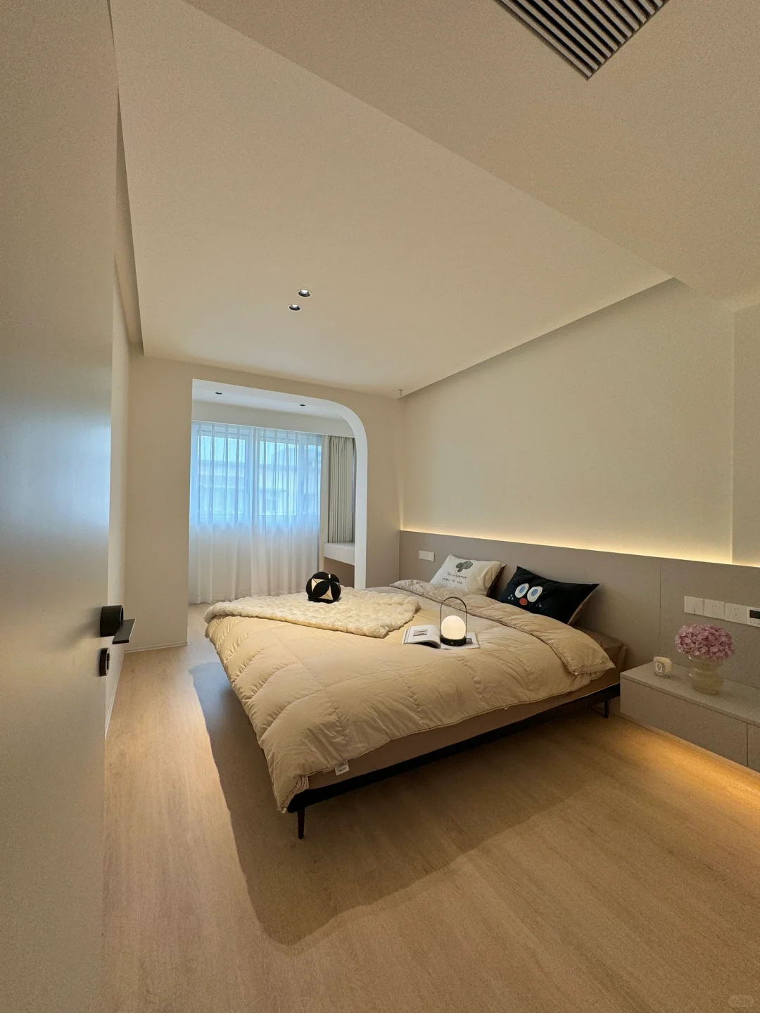 层高不是特别高,所以只下吊10cm做悬浮顶搭配卧室3500k的灯光温馨有层次每一个角落都有自己的氛围感