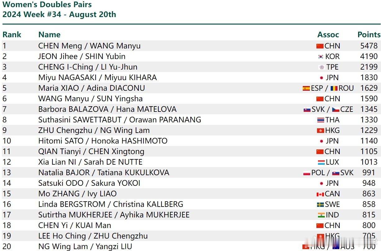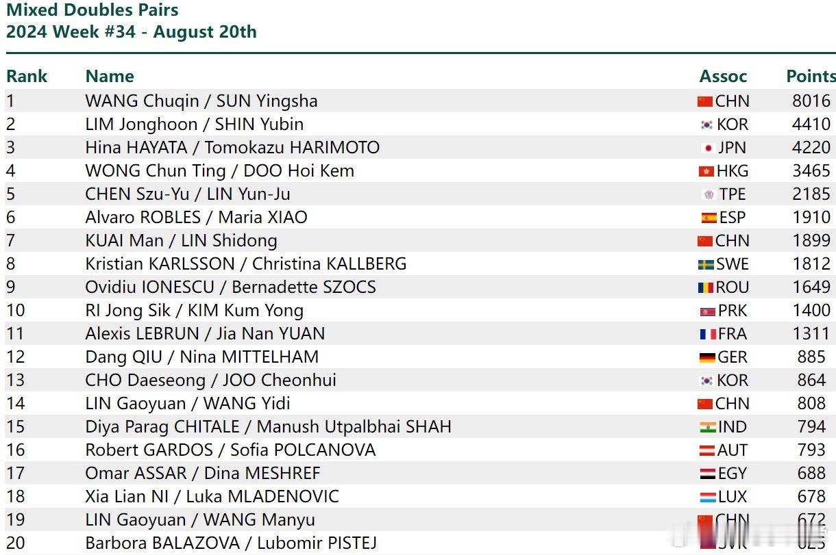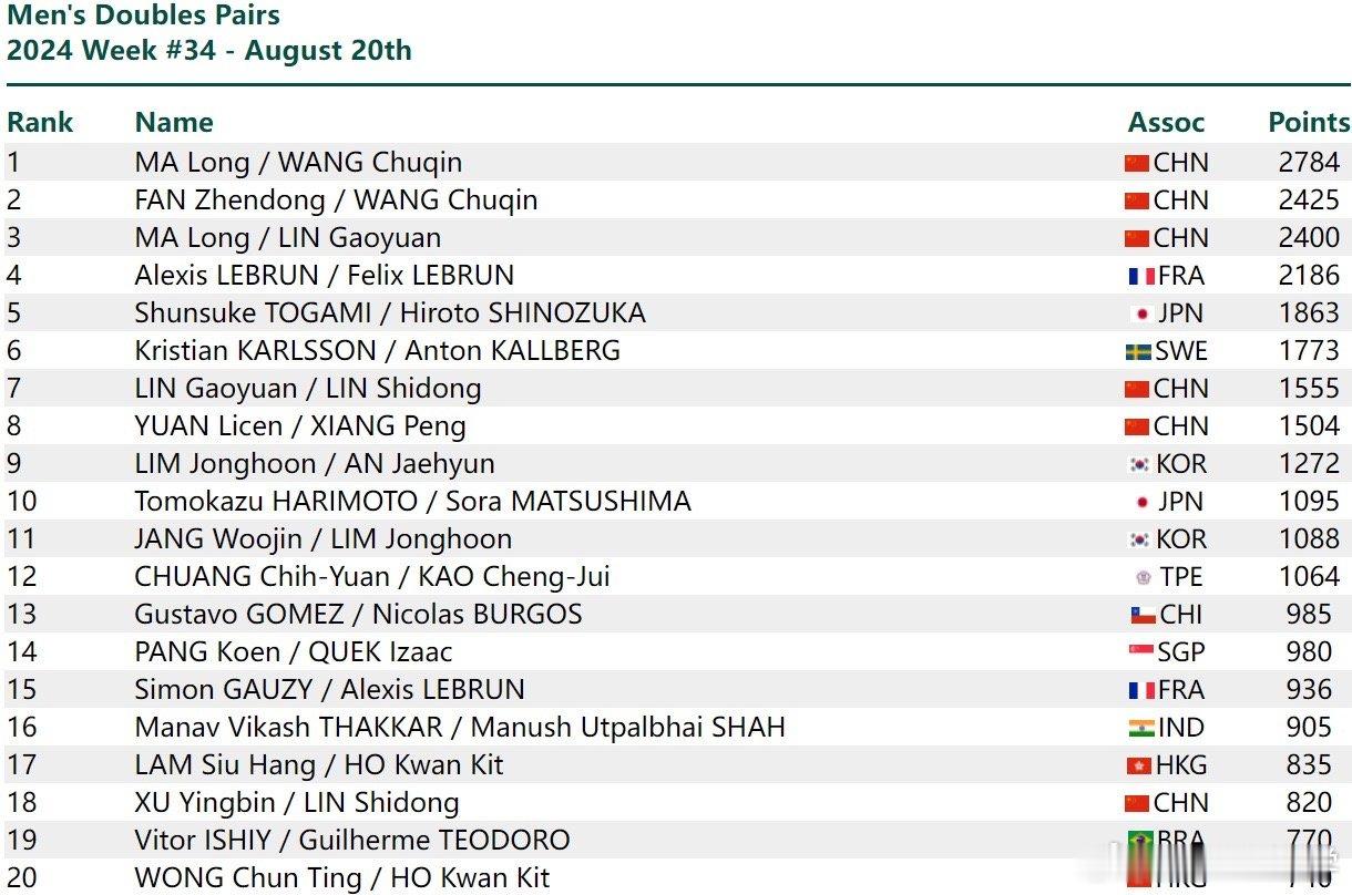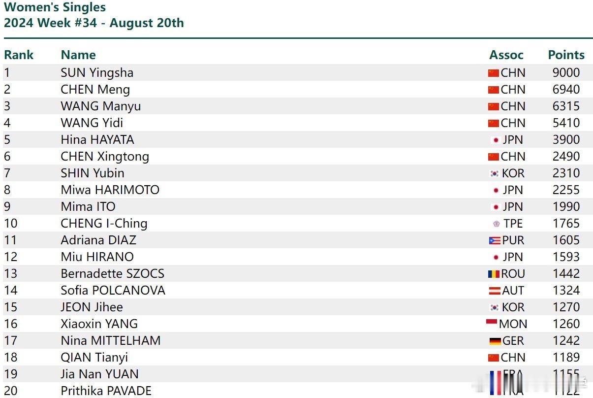 新周期了。#2024国际乒联第34周排名#