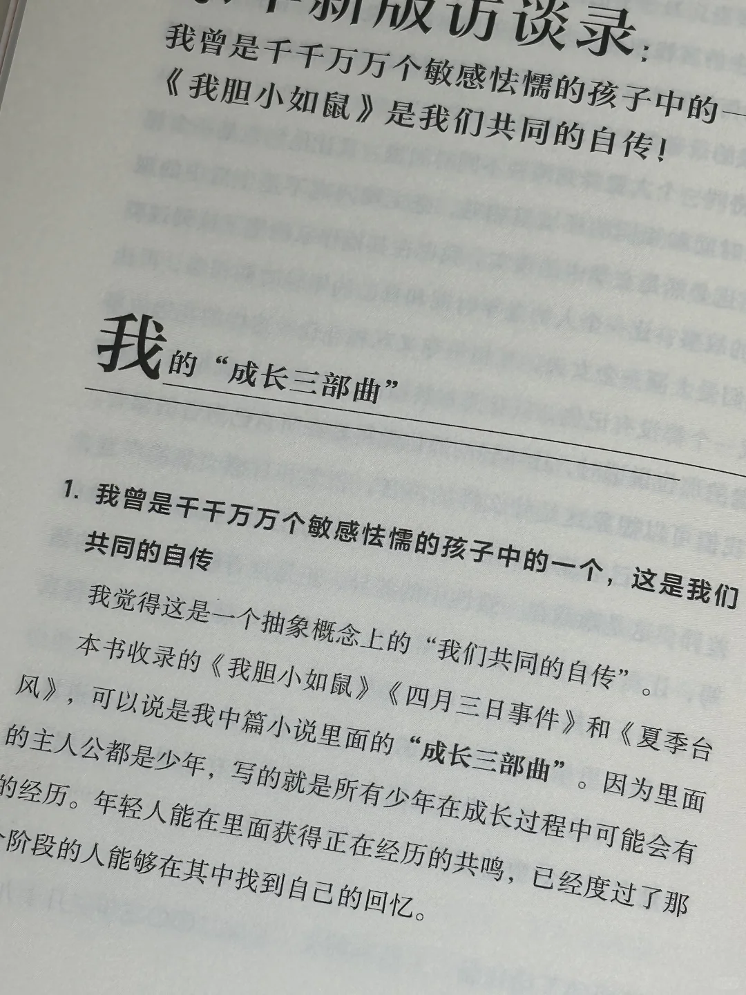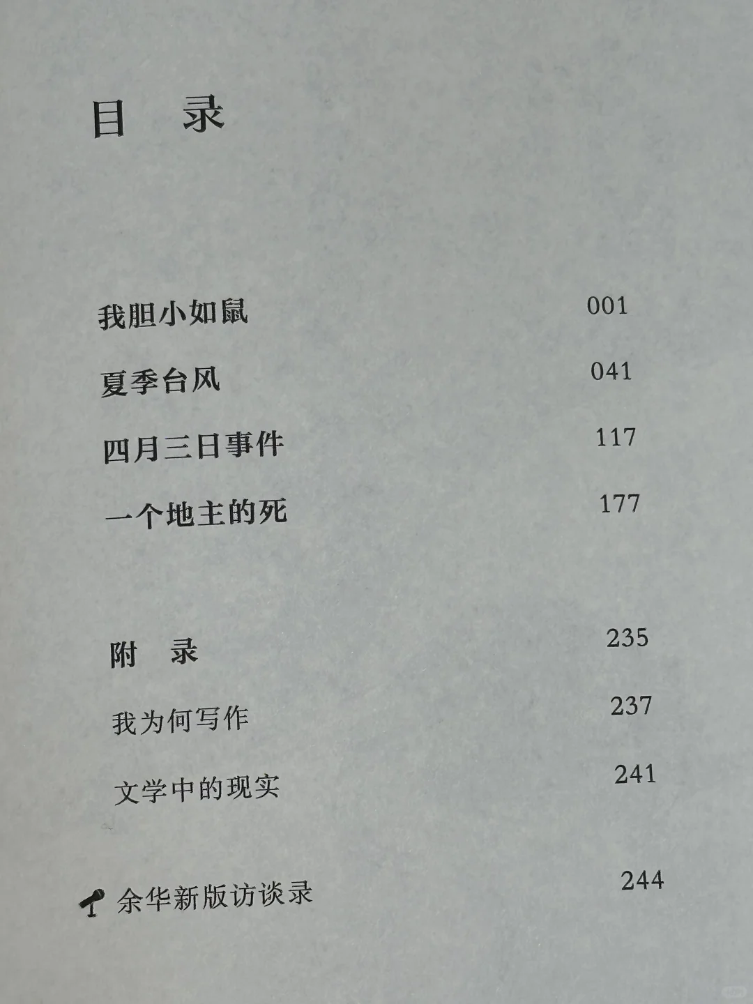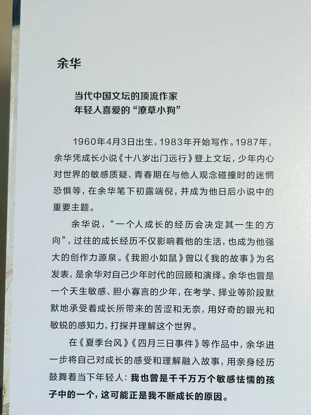 🔖这本书收录了余华创作的《我胆小如鼠》《夏季台风》《四月三日事件》《一个地主的死》四篇中篇小说。故事里包含了他的成长经验,淋漓尽致地呈现了每个人在青春期可能会经历的敏感、自卑和怯懦,让无数普通的、挣扎在人生转折期的年轻人产生强烈共鸣。