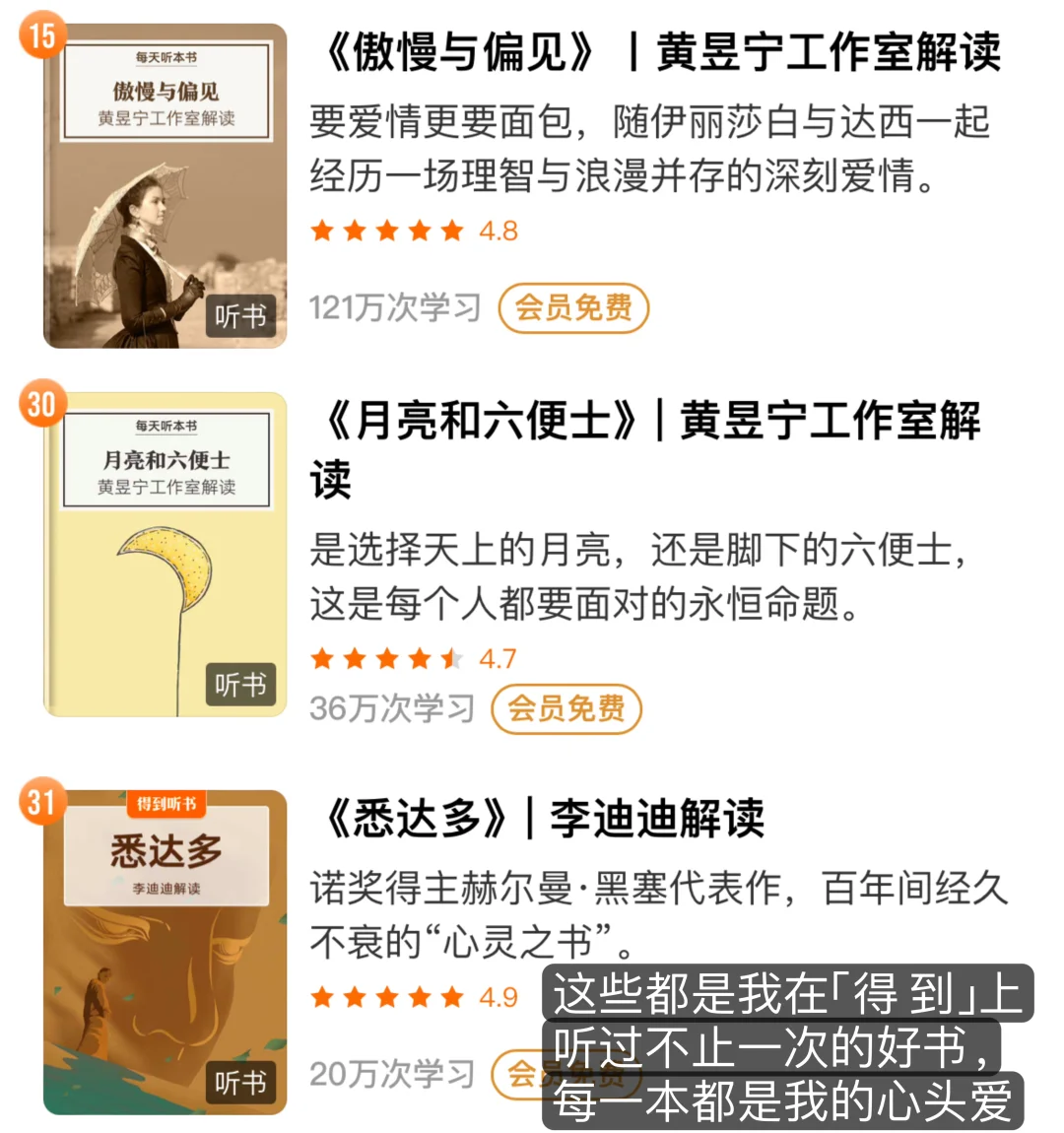 在这个快节奏的时代,对于像瑞秋一样忙碌的打工人来说,静下心来读完一本书的确不容易。听书,就成了我的第二个读书法宝。作为「得.到听书」的忠实粉丝,在上下班路上,在休息间隙,我时常会戴上耳机,打开手机,听老师们解读一本本好书,是学习,更是享受。