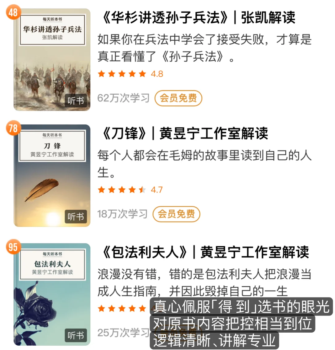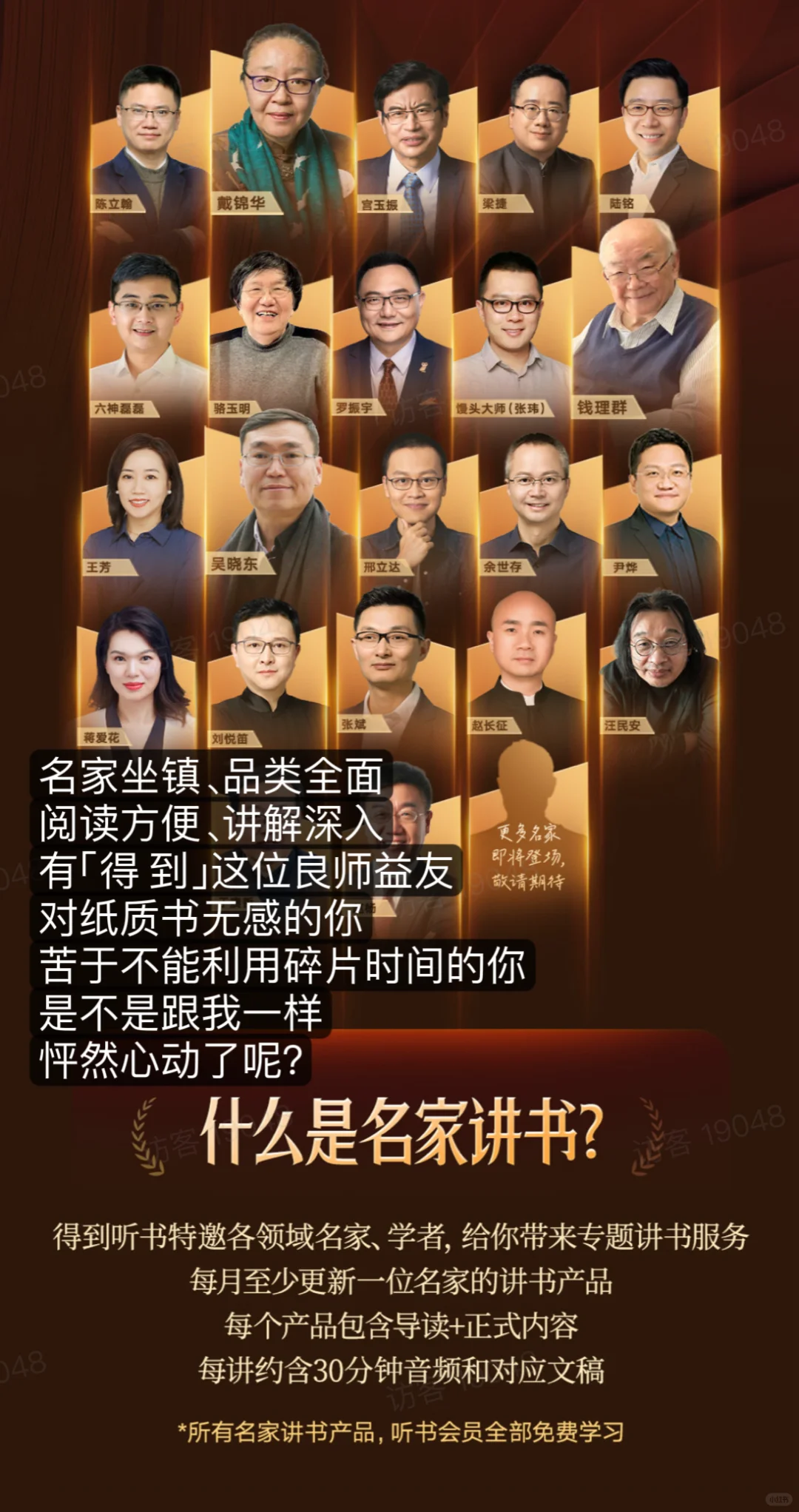 得.到的讲书老师们可不是一般的人物呀,戴锦华、钱理群、蒋爱花、贾行家...个顶个都是业内翘楚,平时要是想听他们亲授一节课可是不容易呢!