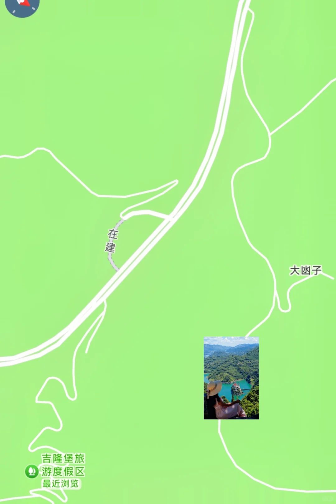 🚗自驾指南:导航吉隆堡旅游度假区(南门),我们是从玉皇顶的云上House转进景湖大道,在景点大门掉头往前开一小段路,就有一条上山小径,从地图上看有“大凼子”这个地名,顺着山路往上开,唯一的分岔路沿右边开,就能开到新角度那里了,全程都是狭窄小路,错车非常困难,请根据具体情况量力而行!