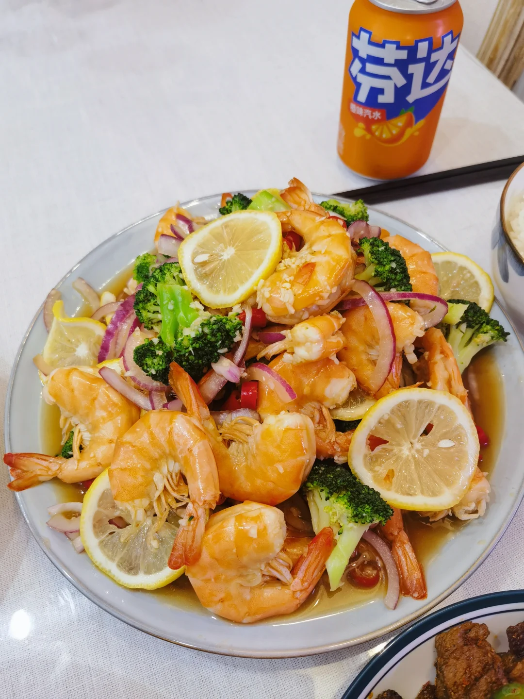 今天我妹跟我吃晚饭,下班做了四个菜,泰式柠檬虾、红烧鱼块、蒜蓉空心菜、干煸孜然羊肉,[满月R]本来还想煲个汤,但我妹说饿了,喝饮料吧