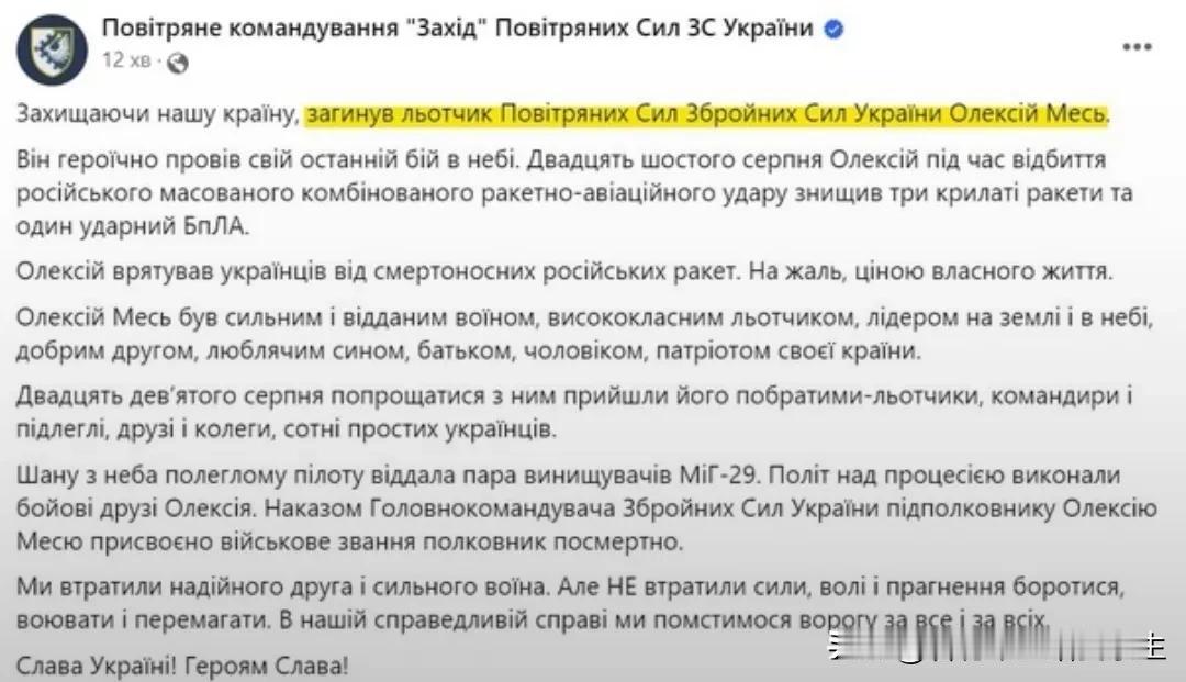 🇺🇦乌克兰武装部队总参谋部正式确认失去了西方提供的第一架F-16战斗机。乌克兰武装部队在反击俄罗斯导弹袭击的同时,使用了F-16战斗机。乌克兰总参谋部周四晚间表示:"F-16在空战中表现出高效率,并能够使用挂载4枚导弹,击落目标"。 "F-16在前往下一个目标的途中,其中一架飞机失去了联系。后来发现,飞机坠毁飞行员死亡"。据悉,乌克兰总参谋部表示:"乌克兰国防部特别委员会正在坠机地区工作,调查坠机原因"。 乌克兰总参谋部的报告是在西方媒体报道基辅失去第一架交付的西方战斗机之后发布的。WSJ报告坠机原因是飞行员的失误,但基辅此前没有评论战斗机的损失。 由10架F-16战斗机组成的第一个战斗机中队乌克兰于2024年7月底接收。前一天,乌克兰卢茨基市议会议员伊戈尔·波利什科克发表了一篇文章,但几分钟后删除了该帖子"死亡8月27日,武装部队中校阿列克谢·梅泽在执行战斗任务时"。梅泽中校是第一位在西方接受F-16飞行员训练超过两年的乌克兰飞行员。