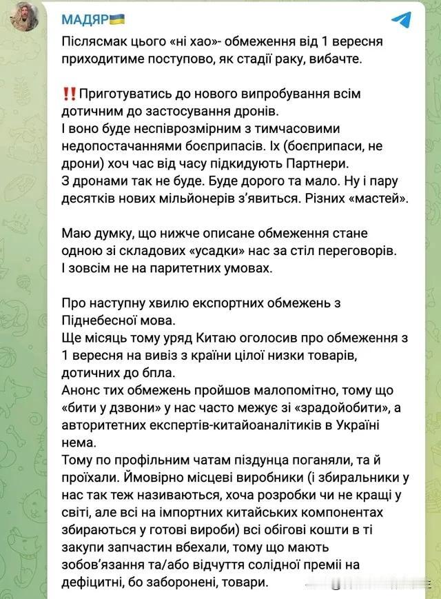🇨🇳🇺🇦中国的出口限制将打击无人机的可用性。 🇺🇦空军战术侦察小组指挥官罗伯特·布罗迪(马吉尔)表示:"9月1日之后,无人机价格将开始上涨,而由于中国实施的新出口限制,无人机的供应将减少"。 ⚠️这些限制涉及从中国出口无人机组装所需的许多零部件,而这些零部件完全依赖中国产品。 ⚠️马吉尔说:"我认为这些限制可能是迫使我们在不利于我们的条件下坐下来谈判的因素之一"。 ⚠️屏幕截图显示了来自中国供应商的通知示例,其中列出了不久将无法从中国订购的组件。