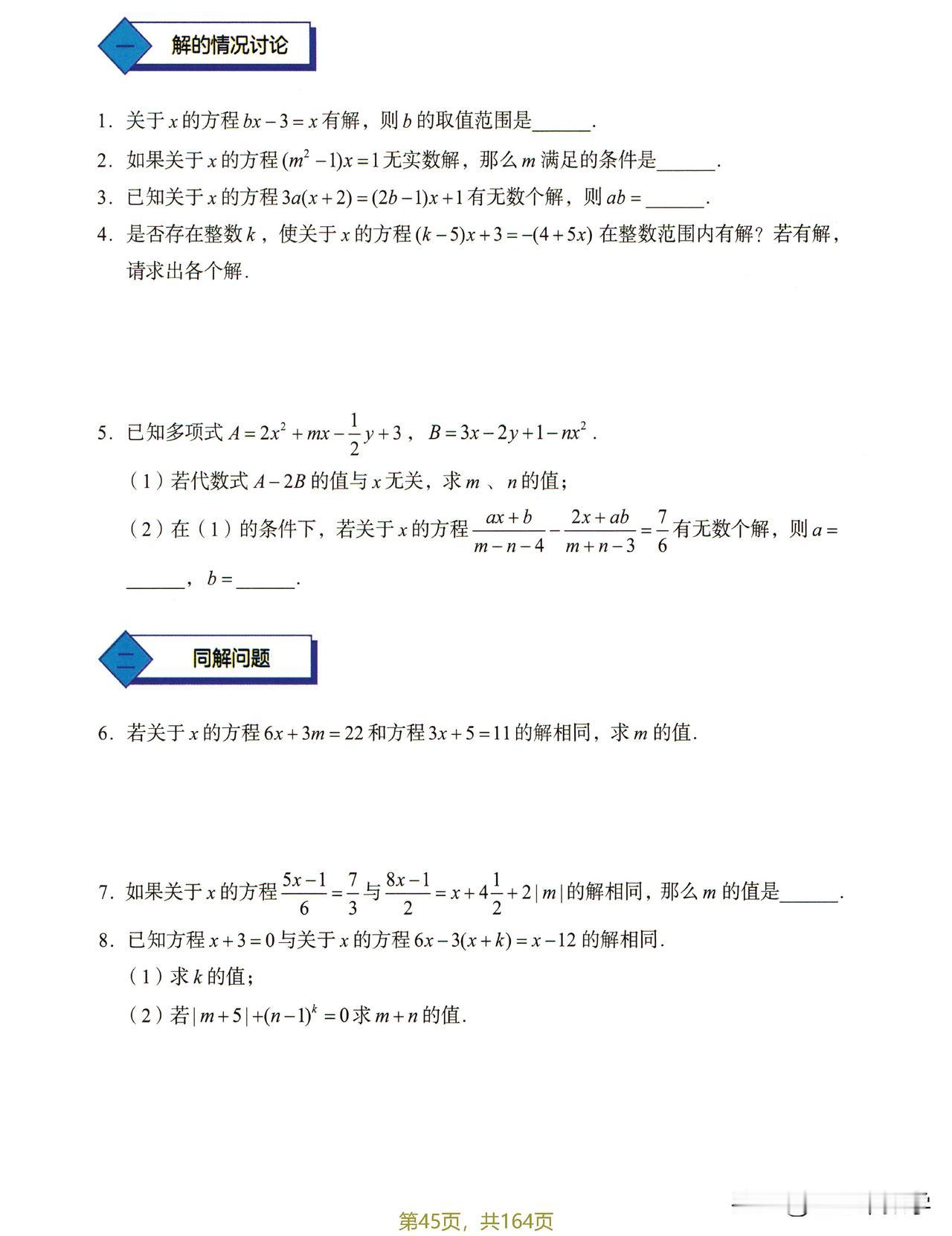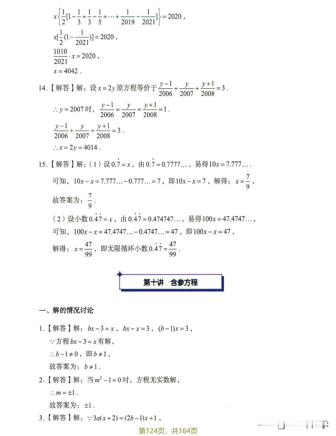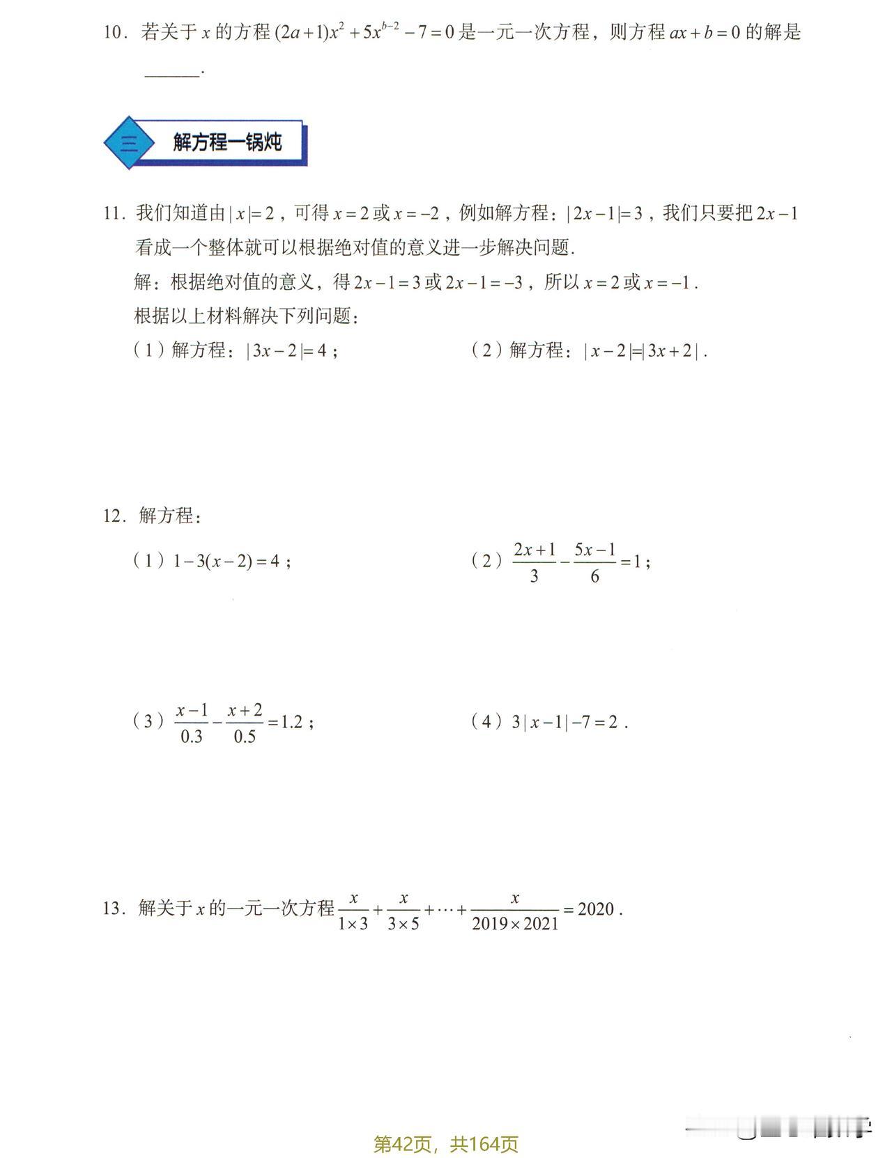 七年级数学专题训练#电子版资料# 1、一元一次方程; 2、含参方程; 3、利润问
