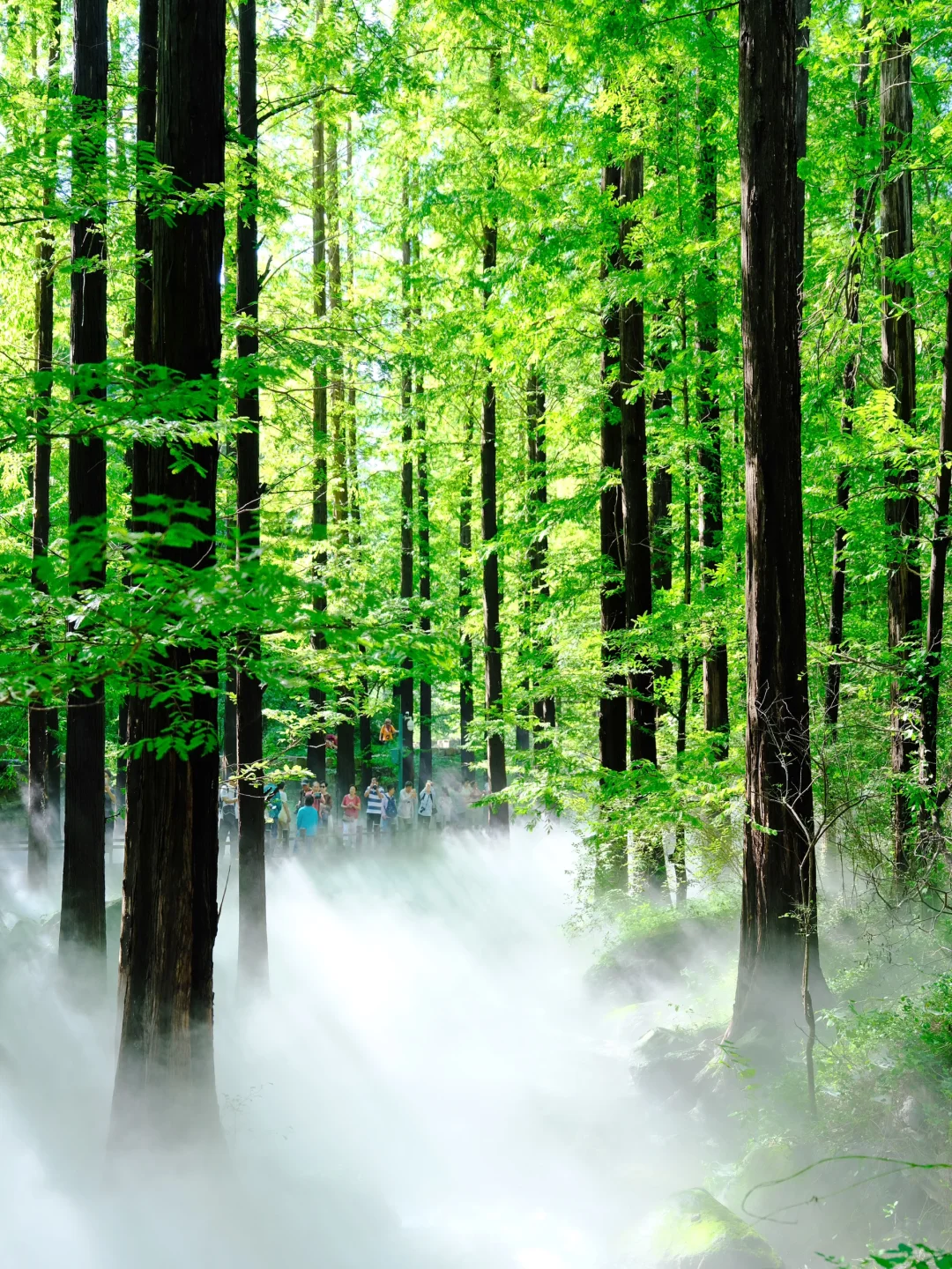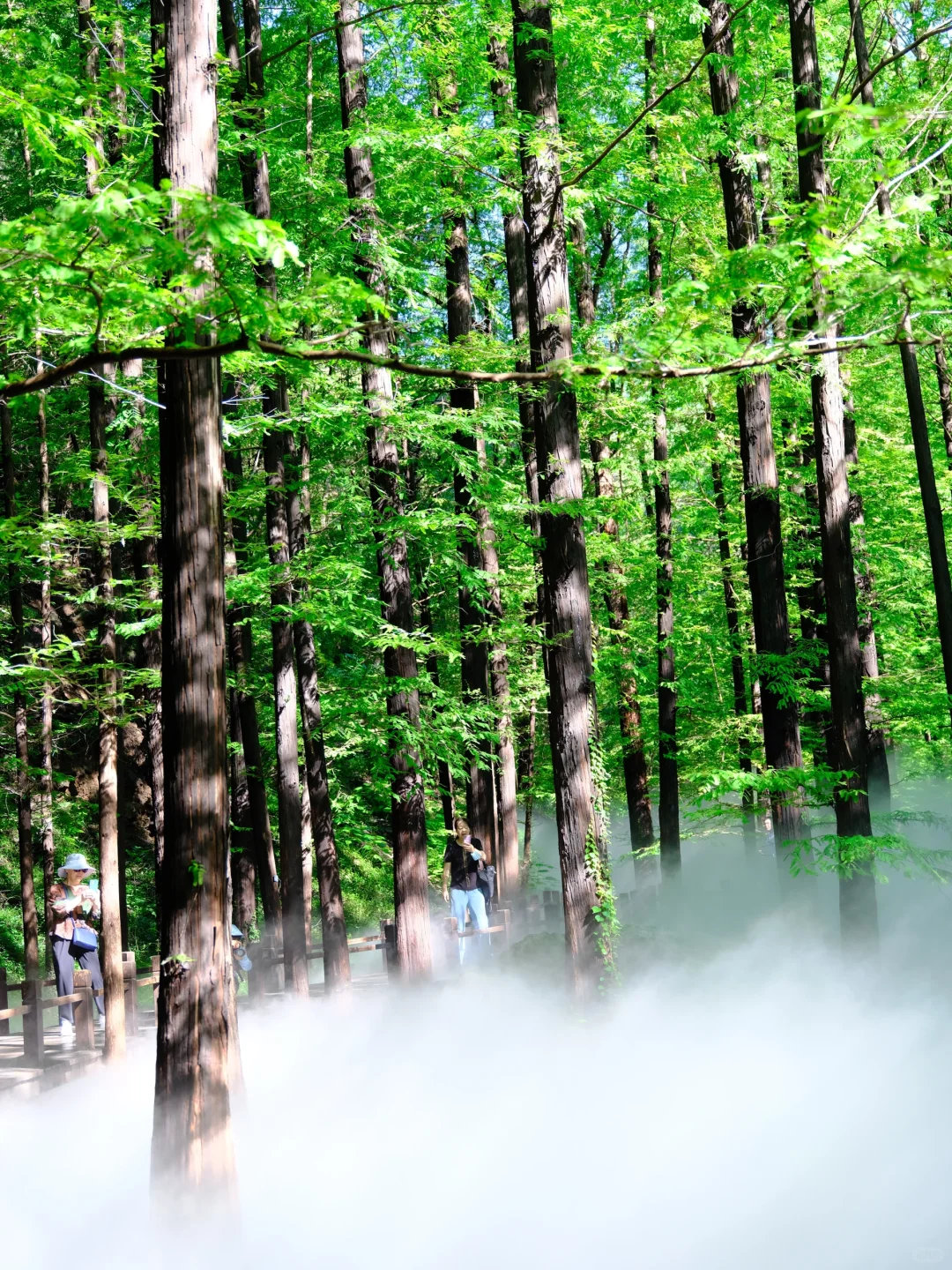 🌳雾气弥漫漫步在蜿蜒木栈道上,云雾缭绕木栈道包裹,水杉林耸立入天的震撼