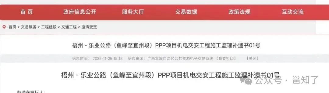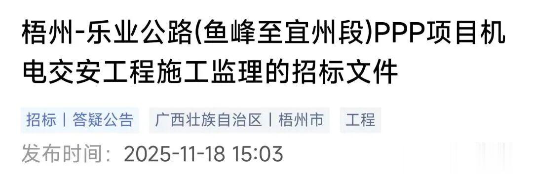 11月18日,梧乐公路(鱼峰至宜州段)PPP项目机电交安工程施工监理标段施工监理招标公告发布。
