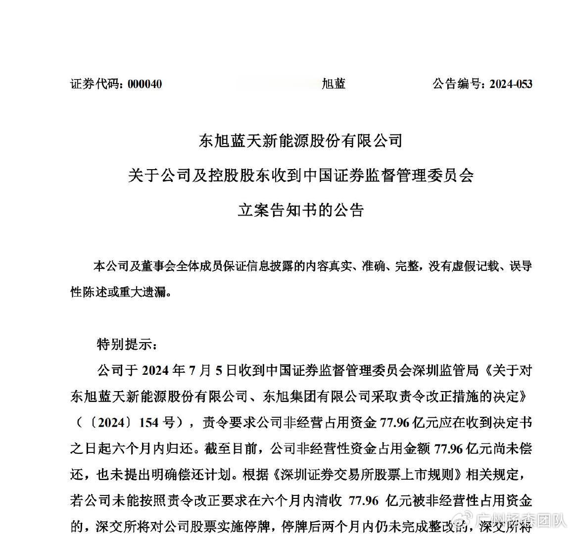 2024年7月5日,东旭蓝天新能源股份有限公司(公司或东旭蓝天)披露,收到中国证监会深圳证监局的《关于对东旭蓝天新能源股份有限公司、东旭集团有限公司采取责令改正措施的决定》(〔2024〕154号)。