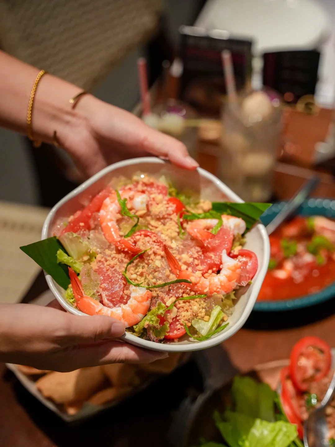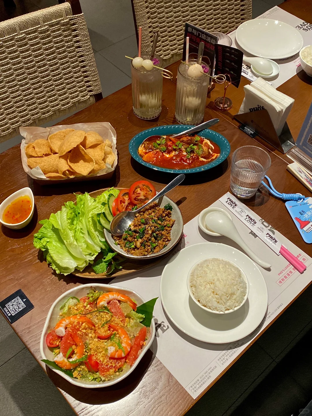 hey~朋友们,好久不见呀 没有更新的日子里 也有在好好吃饭哦! 认真记录📝当下的快乐~ - 最近又挖掘到一家好吃的餐厅🍴 就藏在广粤天地,越南菜为主 还蛮适合我这种口味清淡的人 装修风格简洁大方 搭配粉墨色的火烈鸟🦩点缀 还真有点南洋风的美 - 店铺出品也很不错哦! 越式番茄烩牛腩很推荐👍 牛腩真的超大块,而且炖的蛮软烂入味 番茄酱汁的口感也是调的刚刚好! 一口下去真的让人有点惊喜💃 金不换肉沫生菜包、香茅啫喱柚子大虾鲜蔬沙拉、荔枝冰都挺不错的