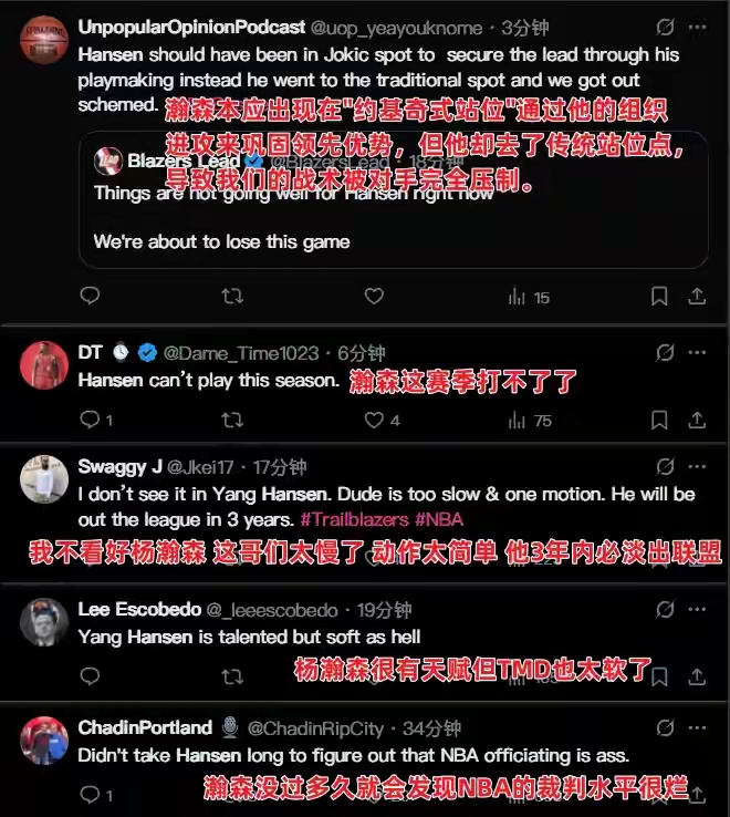 况且杨瀚森面对的还是霍福德和格林这种老油条球员,而且杨瀚森在下半场是越打越出色,只是受困于犯规数满才没能继续表现。外国球迷则是认为杨瀚森表现的太软太慢,直接被勇士队的跑轰节奏带偏了,体能上也是一个大问题,气喘吁吁的画面被拍到多次。好在主教练比鲁普斯给予了他非常大的信任,认为这是年轻球员要成长的挫折,认为杨瀚森可以适应这种场面。