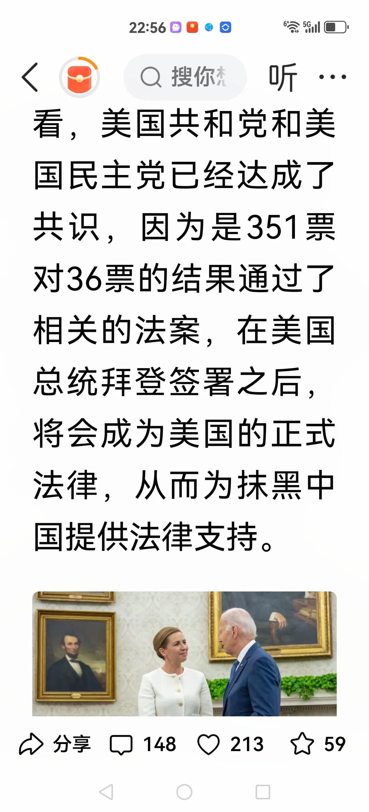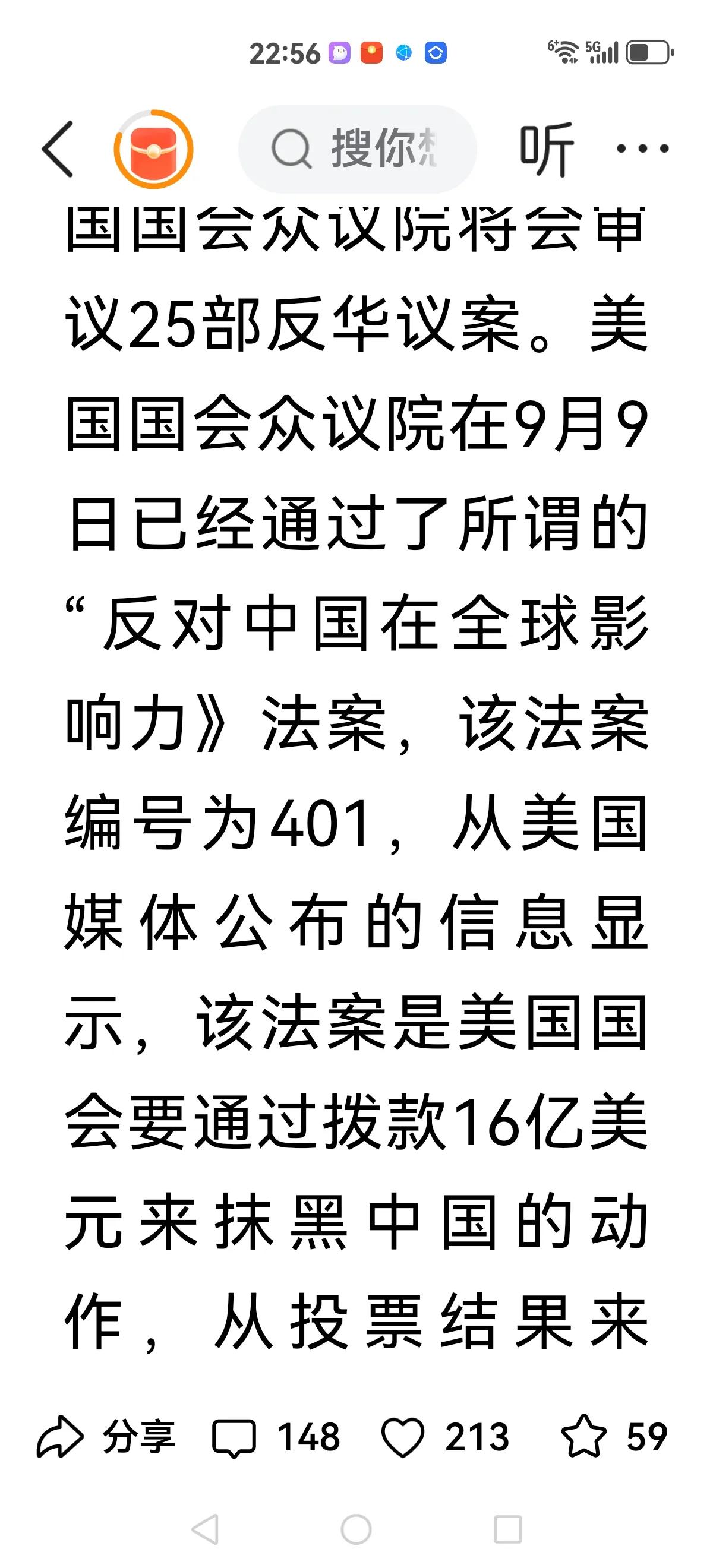 【316票对36票,美众议院通过】 反对中国在全球影响力法案。 该法案编号401 该法案如果通过,拜登拨款16亿。 可能未来这样法案会越来越多,我们不要再幻想“斗而不破”“美国不敢与我们叫板”等等。 即想赚美国人的钱,又想利用模仿美国技术,关键时候不和美国站队,去支持俄罗斯? 成天在张大师,项大师等洗脑下,遥遥领先,弯道超车,样样突破。 你还指望美国是傻子,还要如何呢?