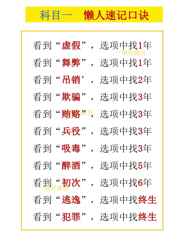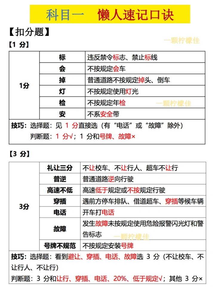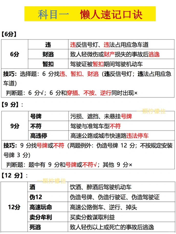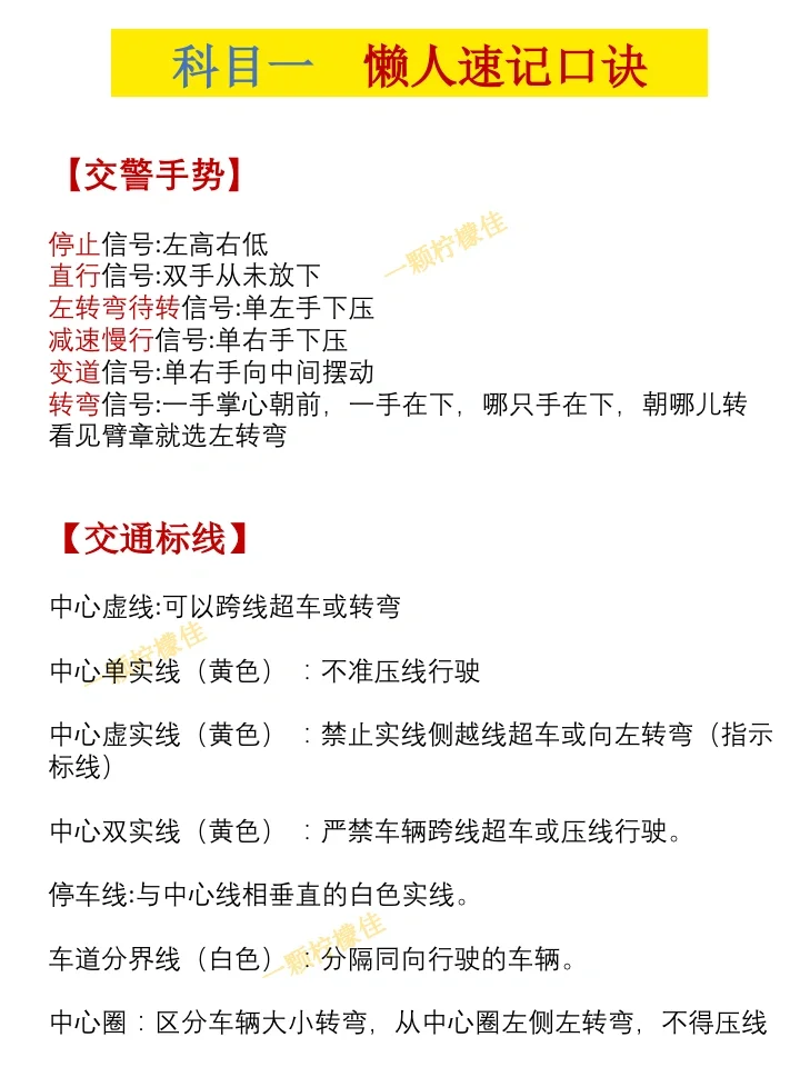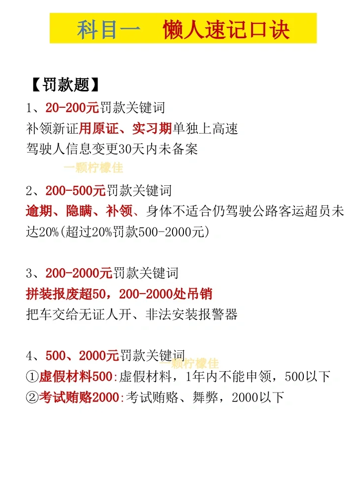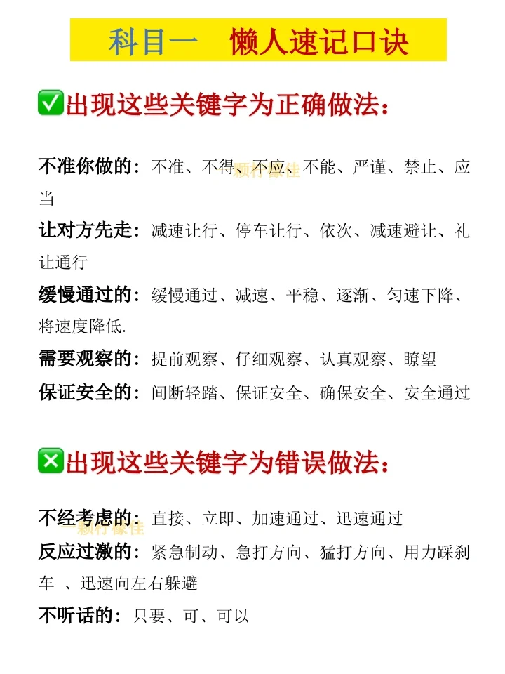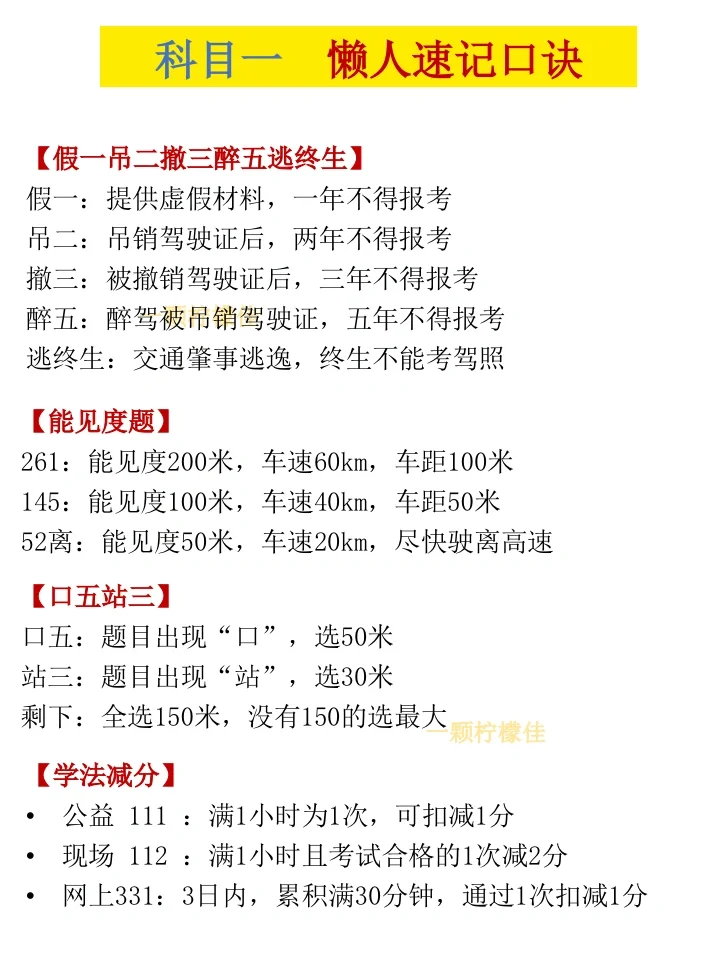 科目一题量很大,只要把口诀背熟,再有针对性地去刷题,一把过轻轻松松~~💘 - 科目一有两大难题,一个是扣分罚款题,一个是交通标志题,把这两大板块都搞定,考试直接拿捏👌🏻 - 在刷题的时候,千万不要陷入题海战术,可以把口诀背熟~💬 . ✍🏻分享一些记口诀的方法: 可以考前几天反复把错题和口诀拿出来念一念背一背;又或者可以去看👀肖肖②小时视频,视频比文字更生动好记一些~ - ㊗️宝子们科目一都一把过,有不懂的可以问我哈~💕