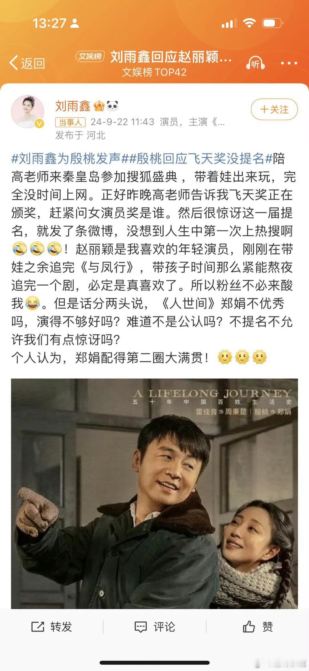 #殷桃回复飞天奖没提名##刘雨鑫回应赵丽颖粉丝#