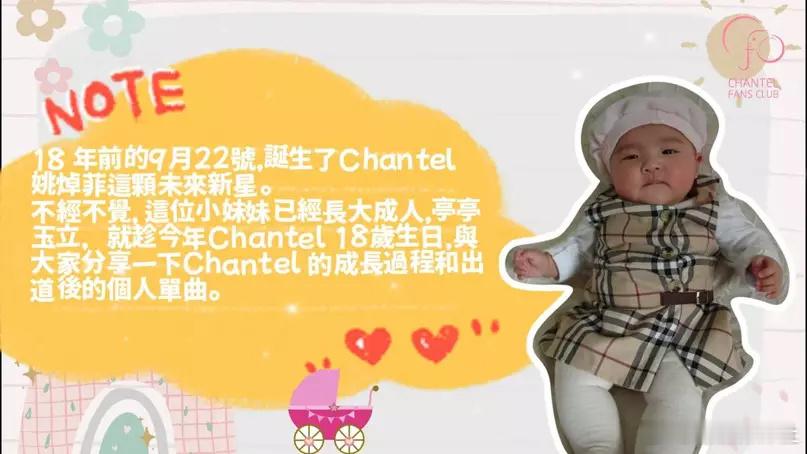 姚焯菲(Chantel)昨日(22日)迎來18歲生日,作為終於成人嘅日子,Chantel除咗獲大批fans為佢慶祝外,仲獲唔少圈中藝人送上祝福!而姚焯菲嘅後援會仲連環送上驚喜,除咗可以見到After Class另類齊人,仲見到一代歌后與BB姚焯菲嘅超大彩蛋!