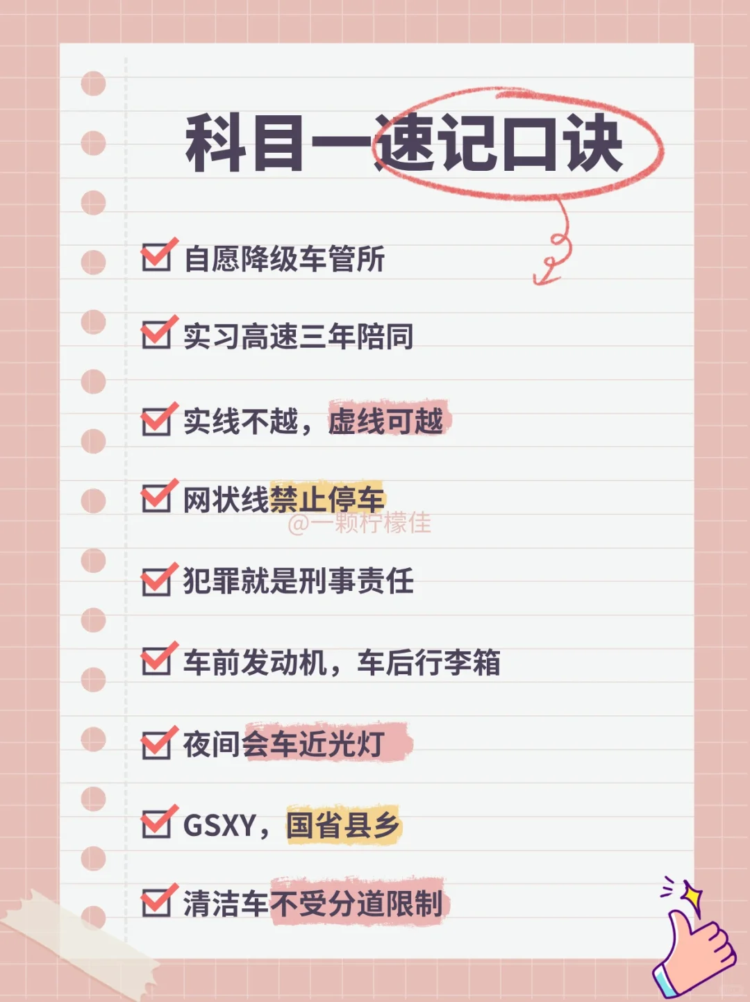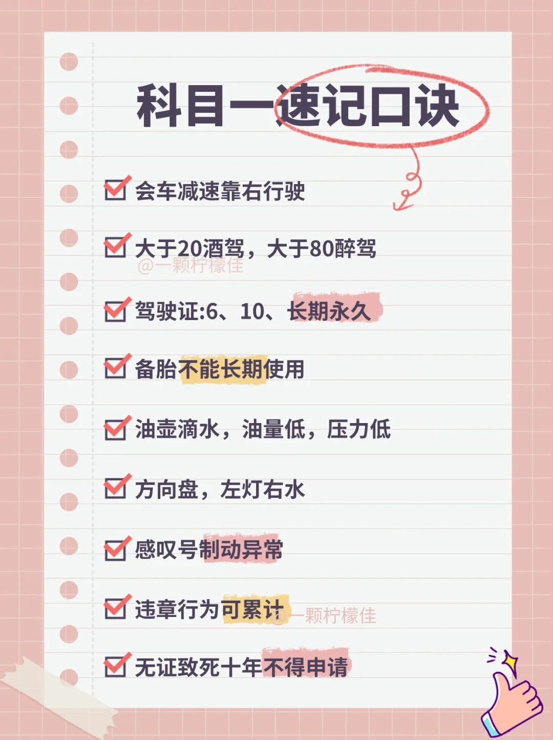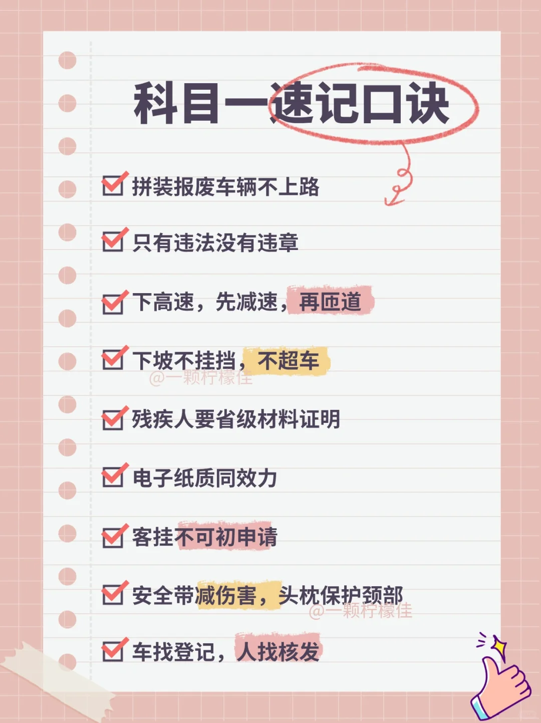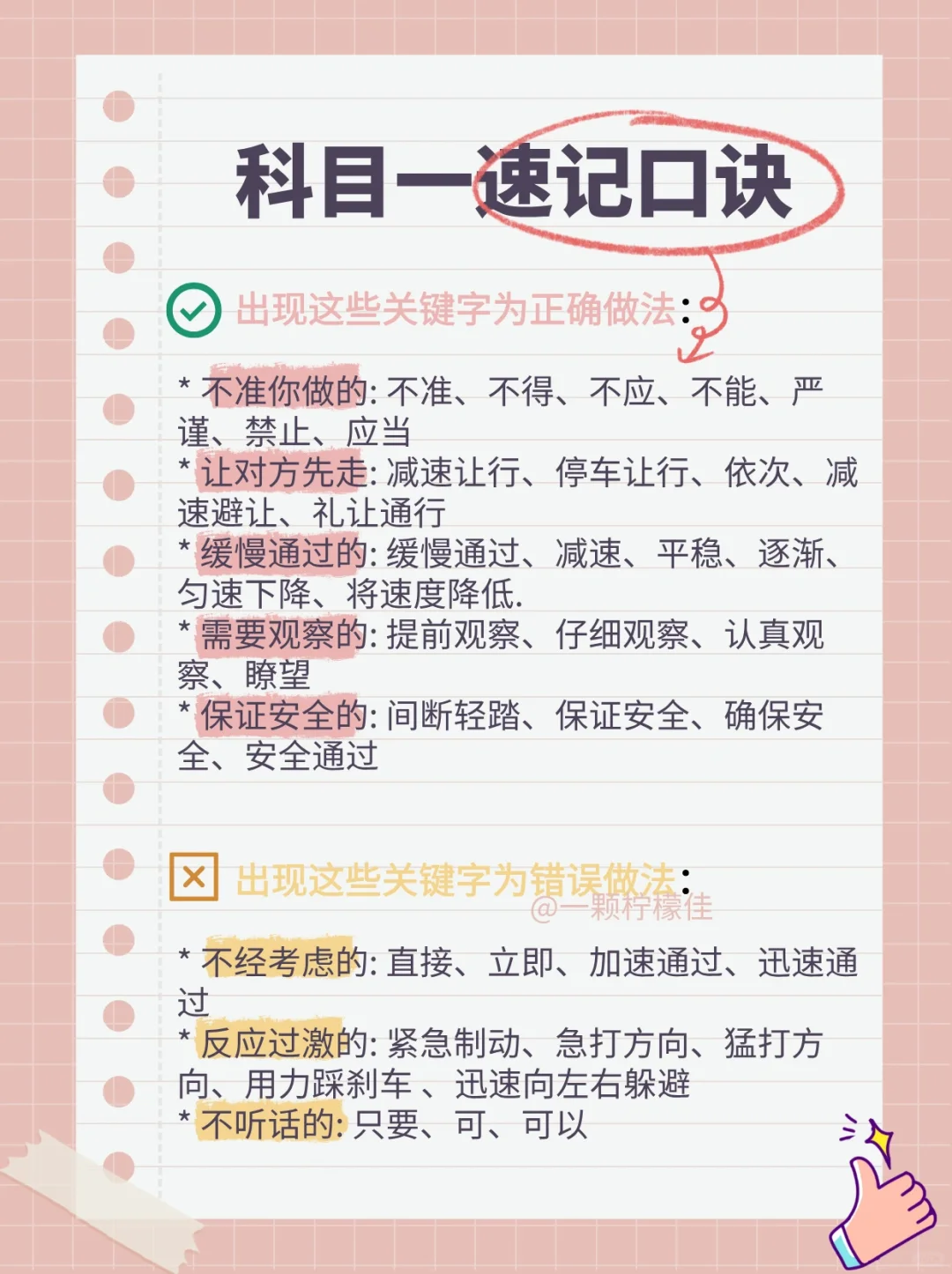 生活需要分享欲 宝子们‼️👋🏼 以过来人的经验告诉大家,科目一千万不要抱侥幸心理!💓 身边就有不少随便看点技巧就去考试的,结果只有60-70分,浪费时间又影响心态😵💫 - 实在懒得刷题,也至少要用1-2天的时间背背科目一速记口诀,多刷刷模拟题,多做几次模拟考试,还可以倍速看看肖肖🌺两小时视频,视频会比文字生动好记哦,另外一定要保持好心态,这样就没问题啦~💯💯💯 - 祝宝子们科目一都一把过哦~~~🍻🍻🍻
