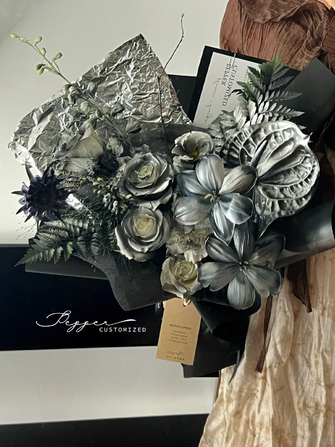 是酷女孩的花花 纪念日礼物花束 南京花店生日礼物花束 纪念日花束 黑银色系花束 送女友闺蜜花束 银黑色系 七夕礼物花束