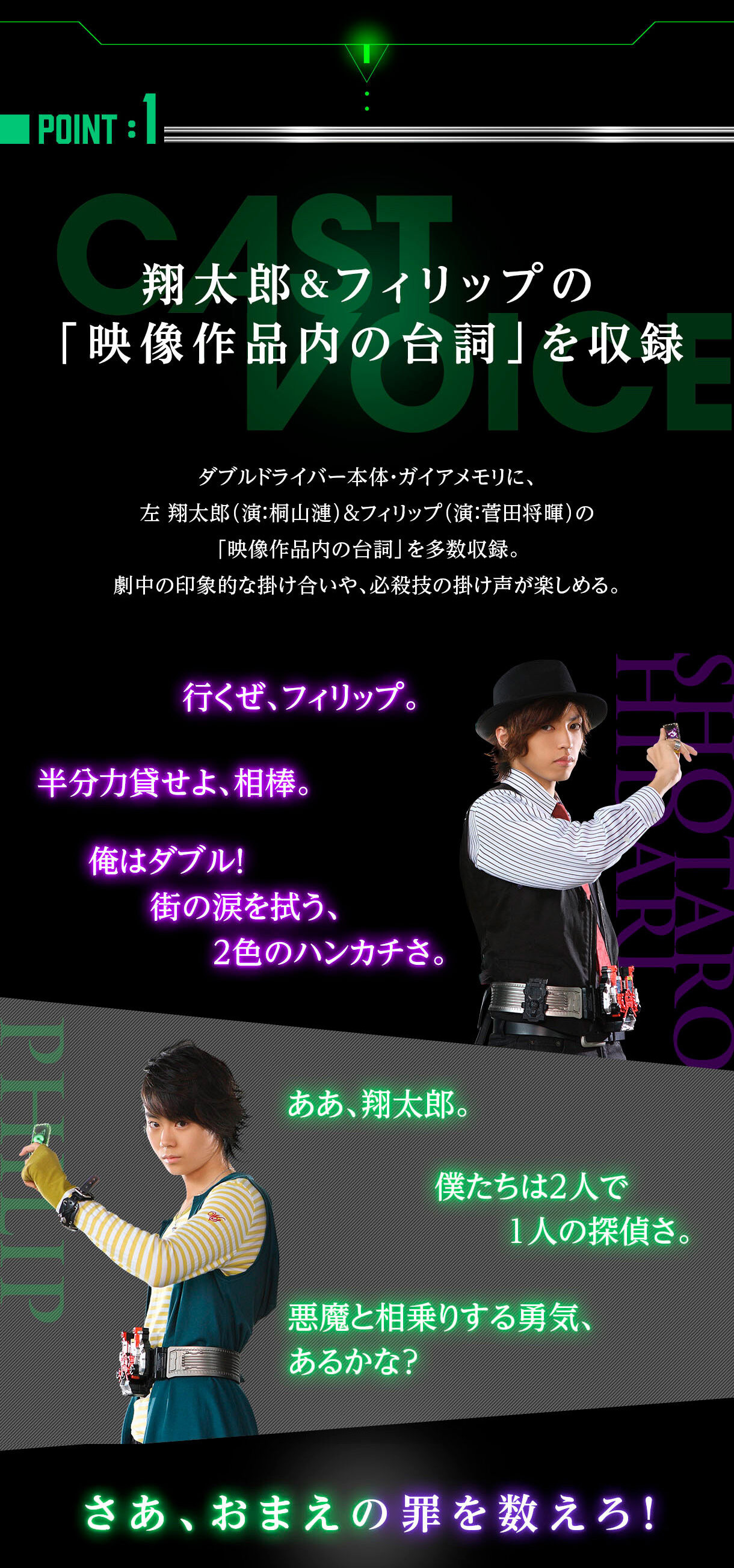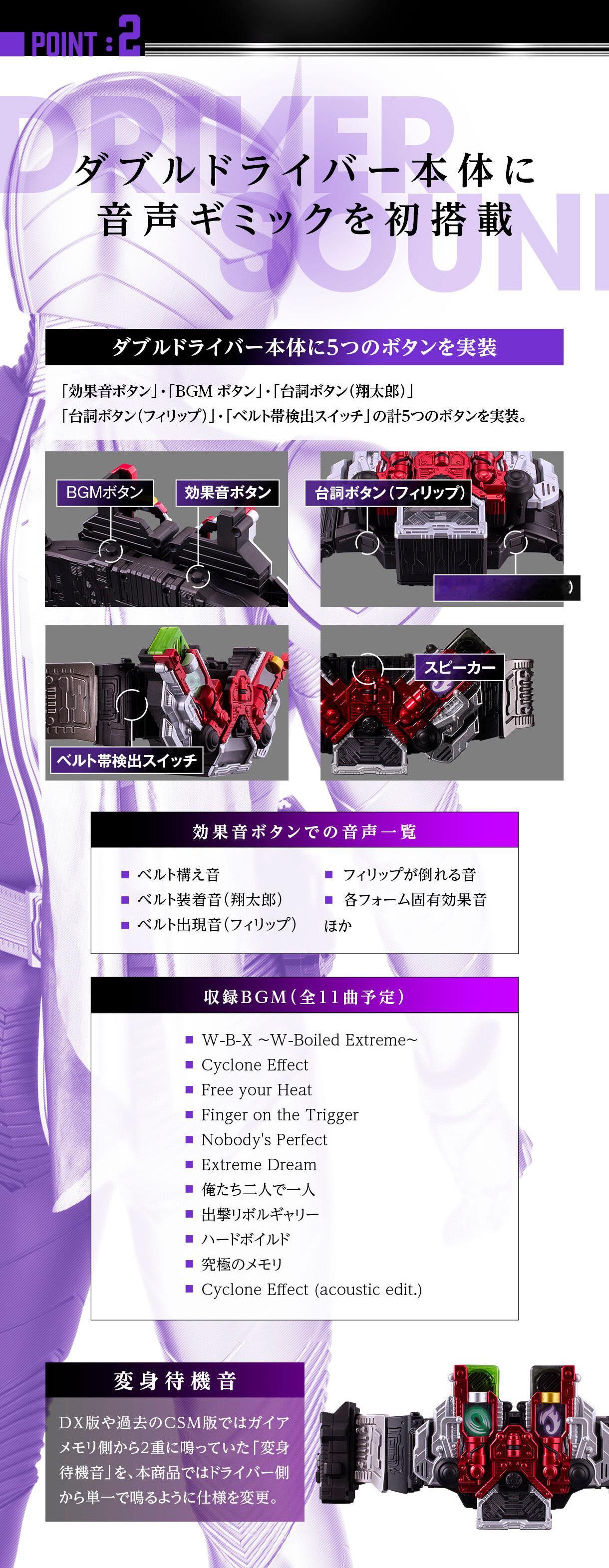 DOUBLE驱动器本体完全新规造型设计,搭载新规电子结构。加入BGM、台词按钮,驱动器本体收录左翔太郎(演:桐山涟)与菲利普(演:菅田将晖)的“影视作品内台词”。收录主题曲《W-B-X ~W Boiled Extreme~》为首的各种BGM,以及腰带装着音、记忆体传送音、菲利普摔倒音等体验剧中变身效果的印象。另外,变身待机音也变更为由驱动器本体发出。