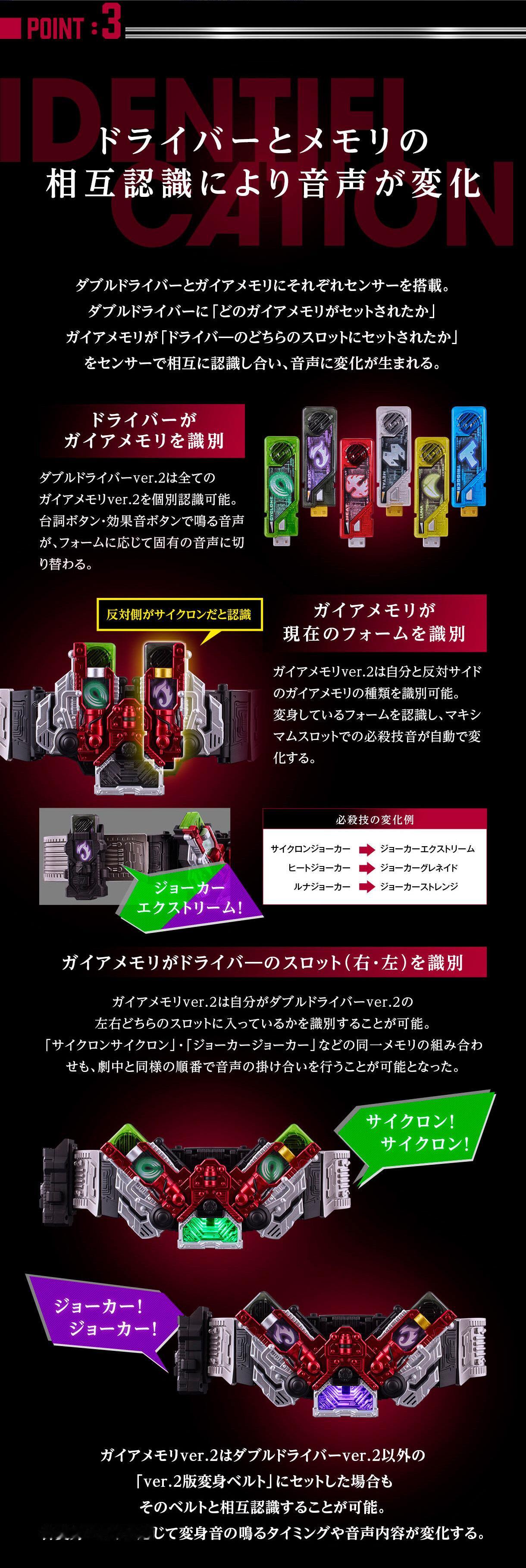 另外,驱动器搭载与盖亚记忆体Ver.2互认识别机能,驱动器本体可以识别填装的Ver.2记忆体是哪条,从哪个插槽填装,根据Ver.2记忆体不同音效也不同。