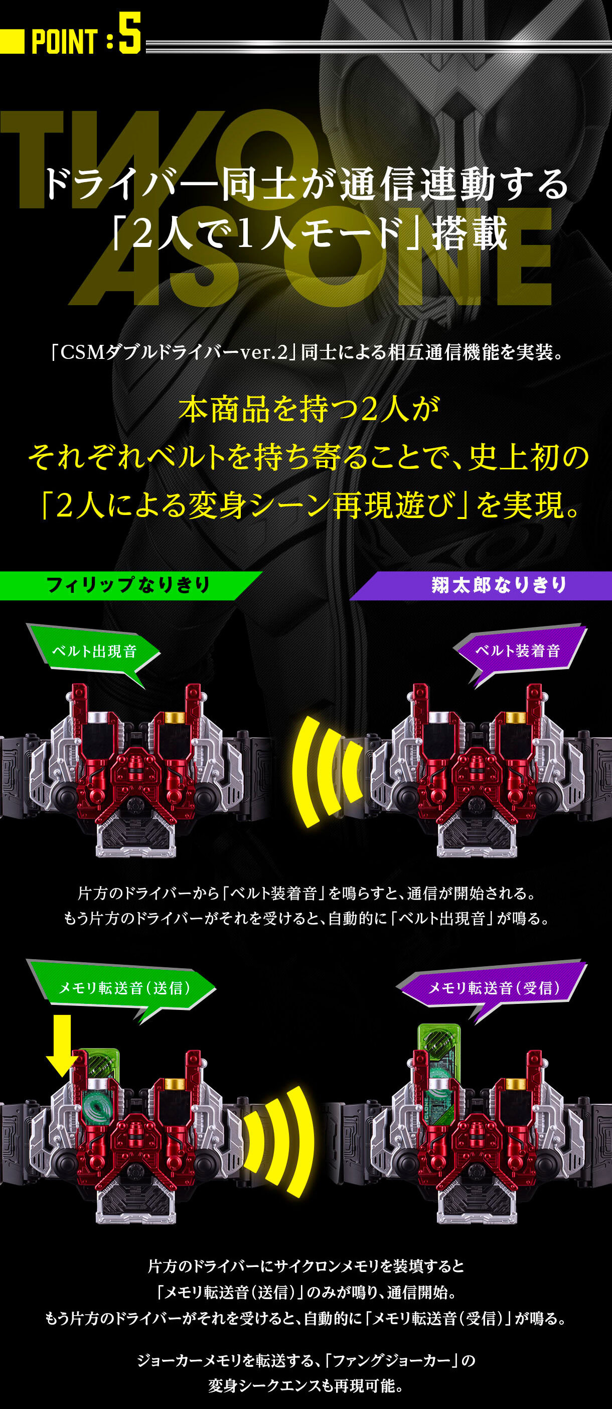 假面骑士W变身最大特点就是“两人变身”,此次加入“二人一体模式”,两条“Ver.2驱动器”之间可以进行通信变身:单条腰带发出“腰带装着音”之后,将对另一条腰带发出红外线,另一条腰带自动发出“腰带出现音”,其后填装CYCLONE记忆体后,发动“记忆体传送音(传送)”,红外线通信后另一条腰带自动发动“记忆体传送音(接受)”,再现2人同时变身假面骑士W的场景。