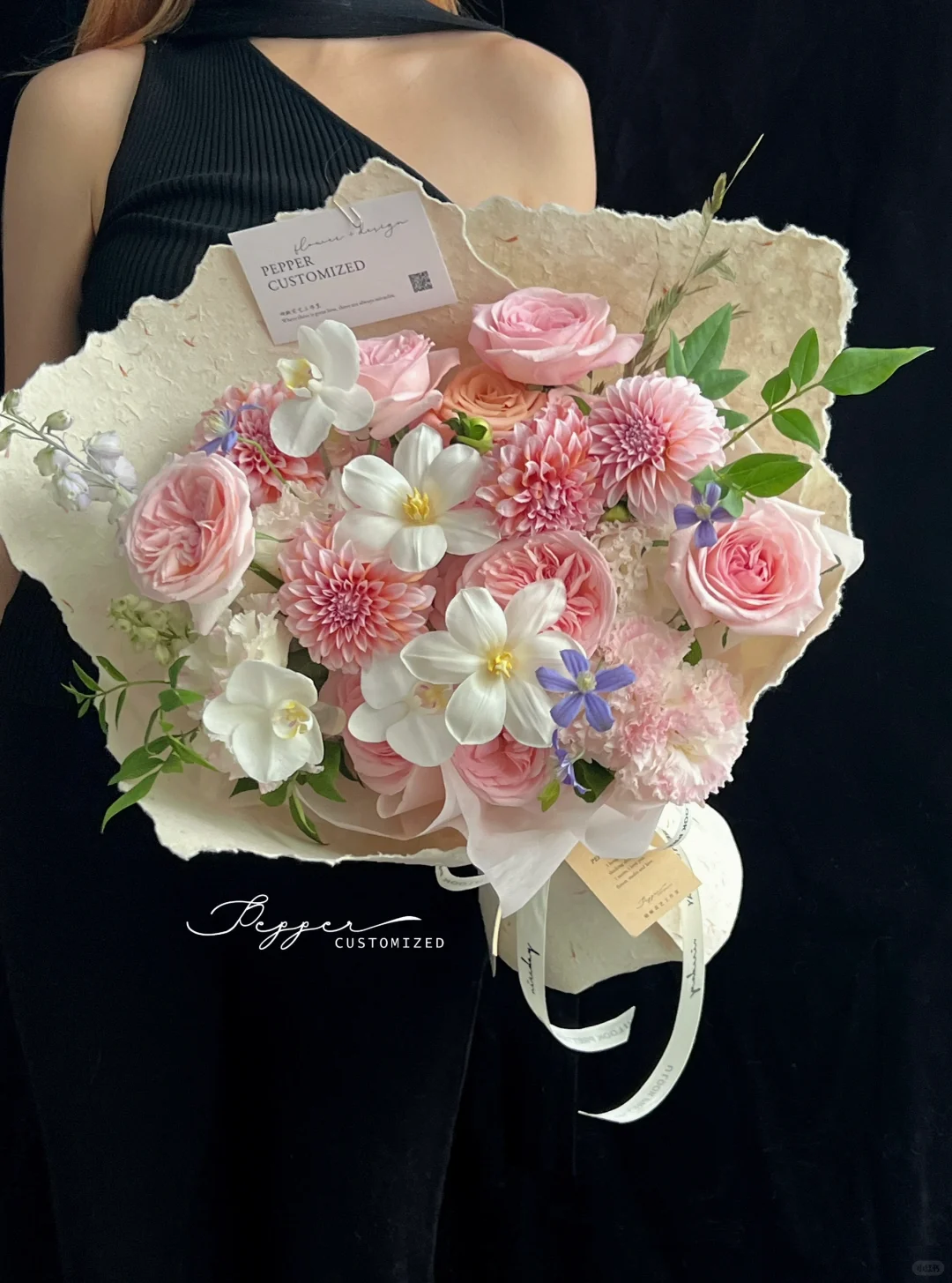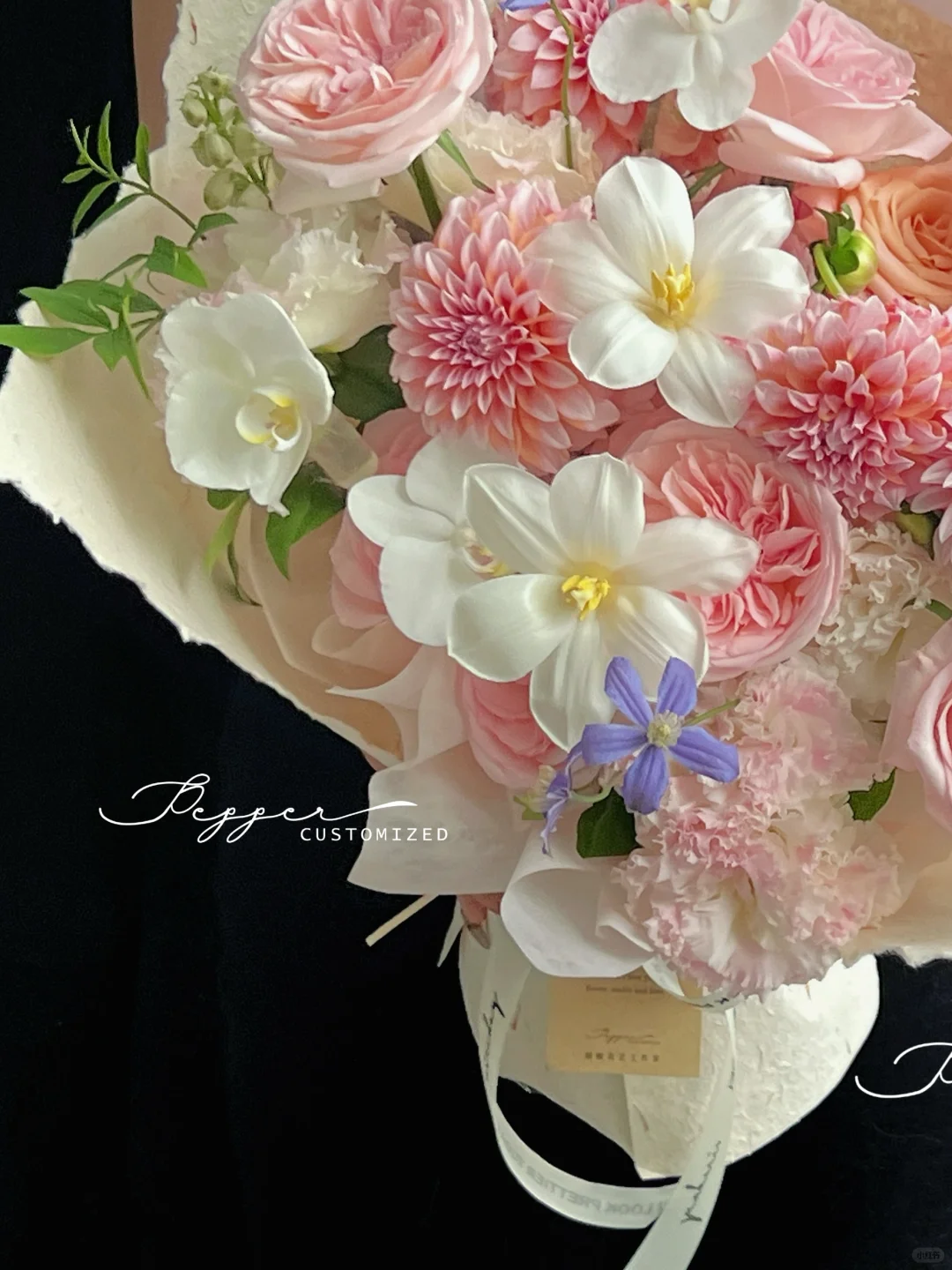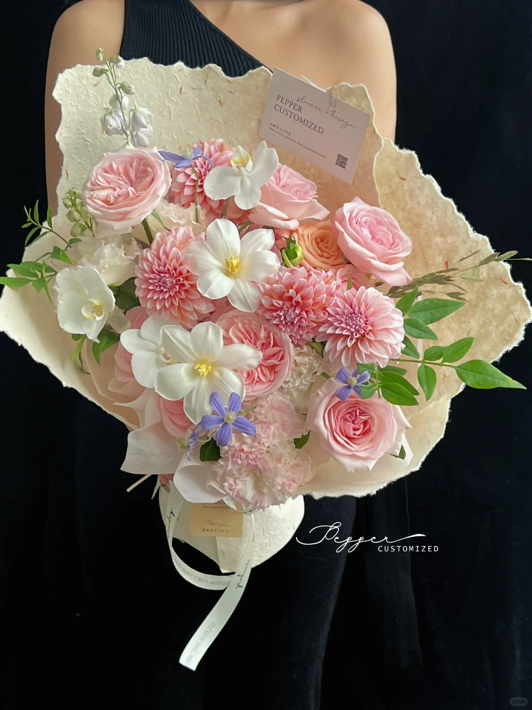 夏日桃子 花材有 奶油桃子 粉荔枝 进口郁金香 铁线莲 冰激凌桔梗 九星叶 蝴蝶兰 微光 大飞燕 小盼草 七夕花束 纪念日礼物花束 送女友闺蜜花束 生日礼物花 52 支玫瑰花束 情人节花束 小众花束礼物