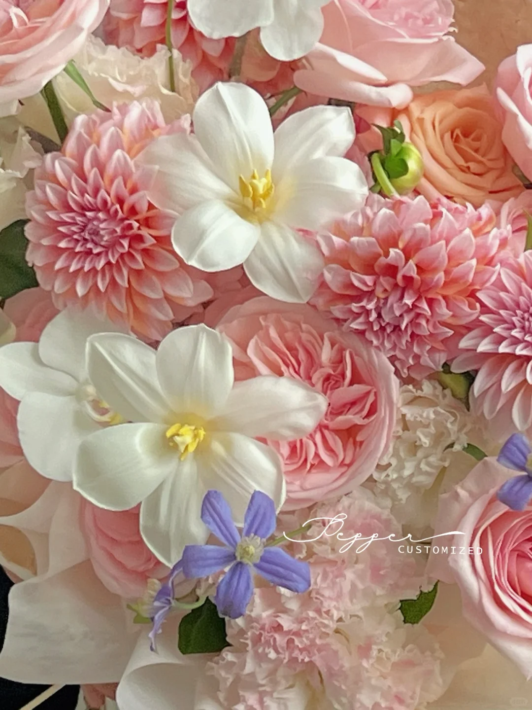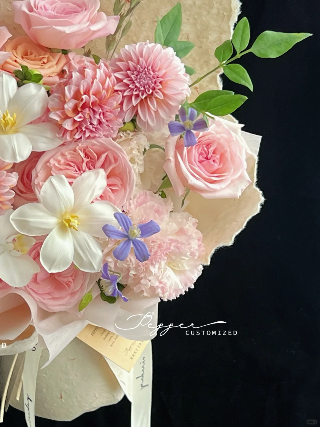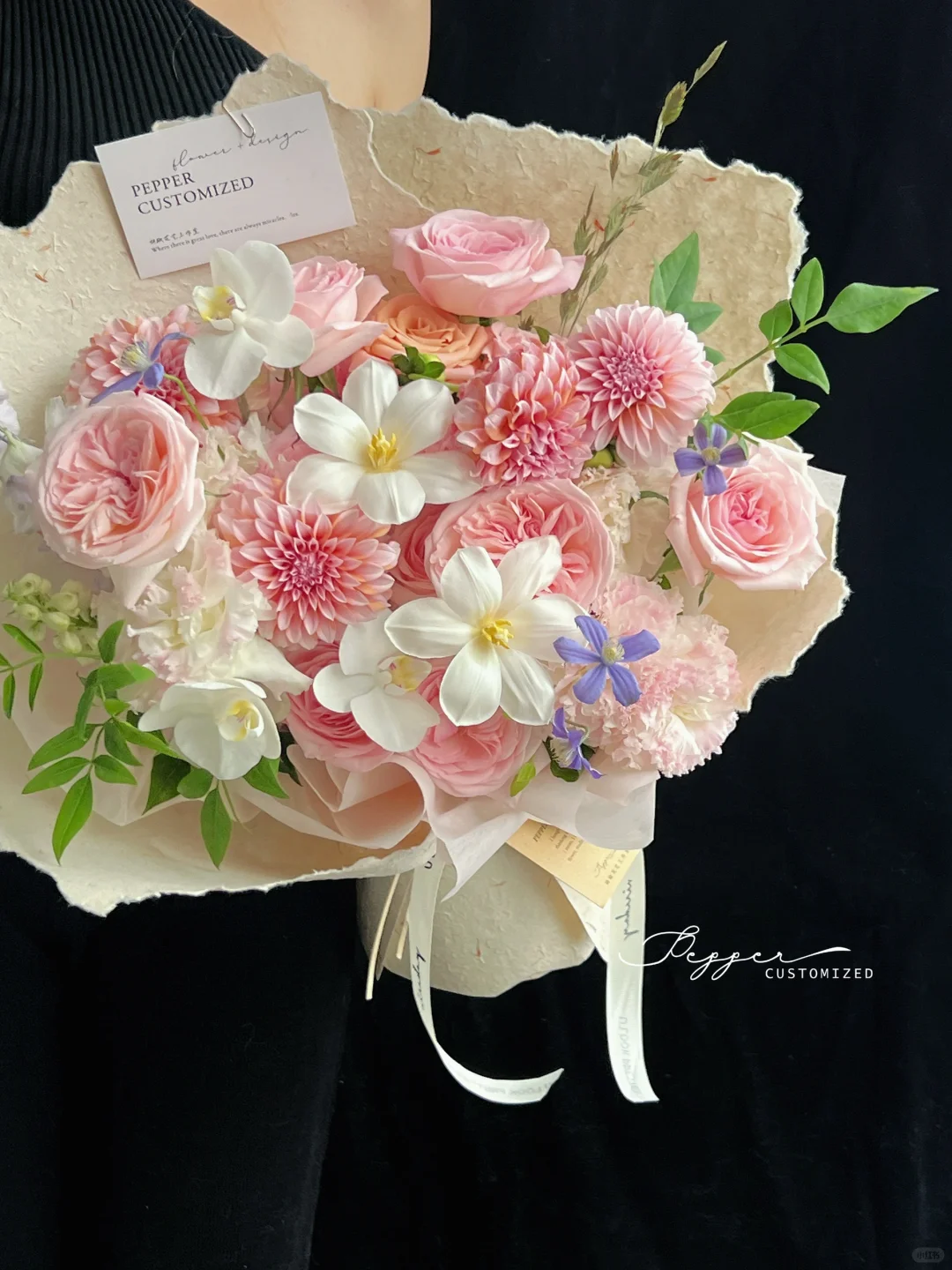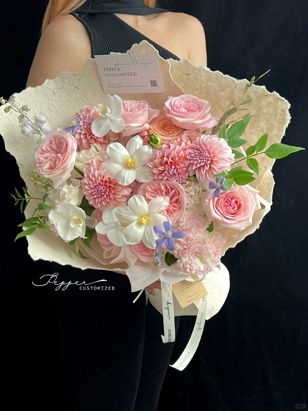 夏日桃子 花材有 奶油桃子 粉荔枝 进口郁金香 铁线莲 冰激凌桔梗 九星叶 蝴蝶兰 微光 大飞燕 小盼草 七夕花束 纪念日礼物花束 送女友闺蜜花束 生日礼物花 52 支玫瑰花束 情人节花束 小众花束礼物