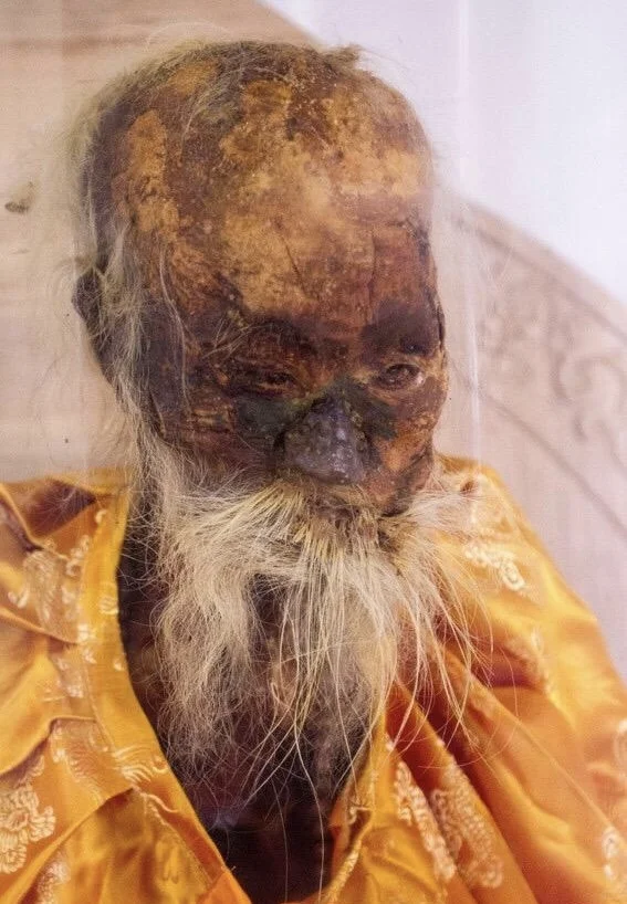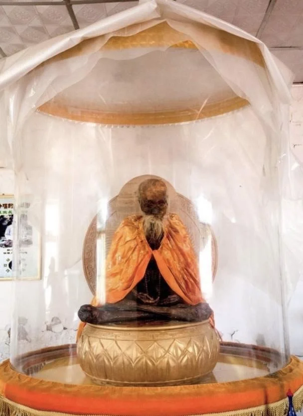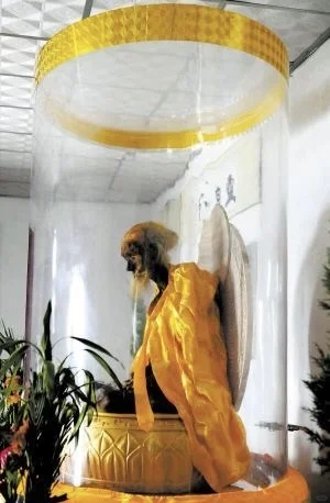 在灵泉寺内的“吴云青真身馆”中,有一尊高约1米的高僧吴云青结跏趺坐不腐肉身,被放置于一个高约1.5米的椭圆形水晶罩内,供那些善男信女瞻仰。