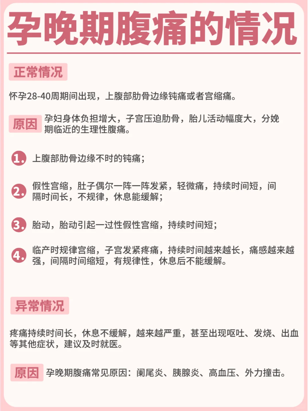 [向右R][向右R] 给大家整理了孕早期、孕中期、孕晚期腹痛的常见原因,以及异常腹痛的特点,出现腹痛时可以先加以鉴别,如果经过休息后疼痛一直持续出现,不能缓解,甚至伴随着其他症状,一定要及时找白大褂朋友。