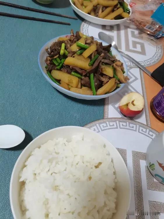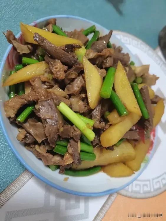 今天的晚饭有点晚啊,路上堵车,回来的有点晚了,一下不知道吃啥,从冰箱里翻出来点儿牛杂,那就炒牛杂吧,放了点儿土豆还有蒜苔搭配上,还挺有食欲的,土豆条让我切的有点大了,没太煮软,不过孩子们吃的挺香。