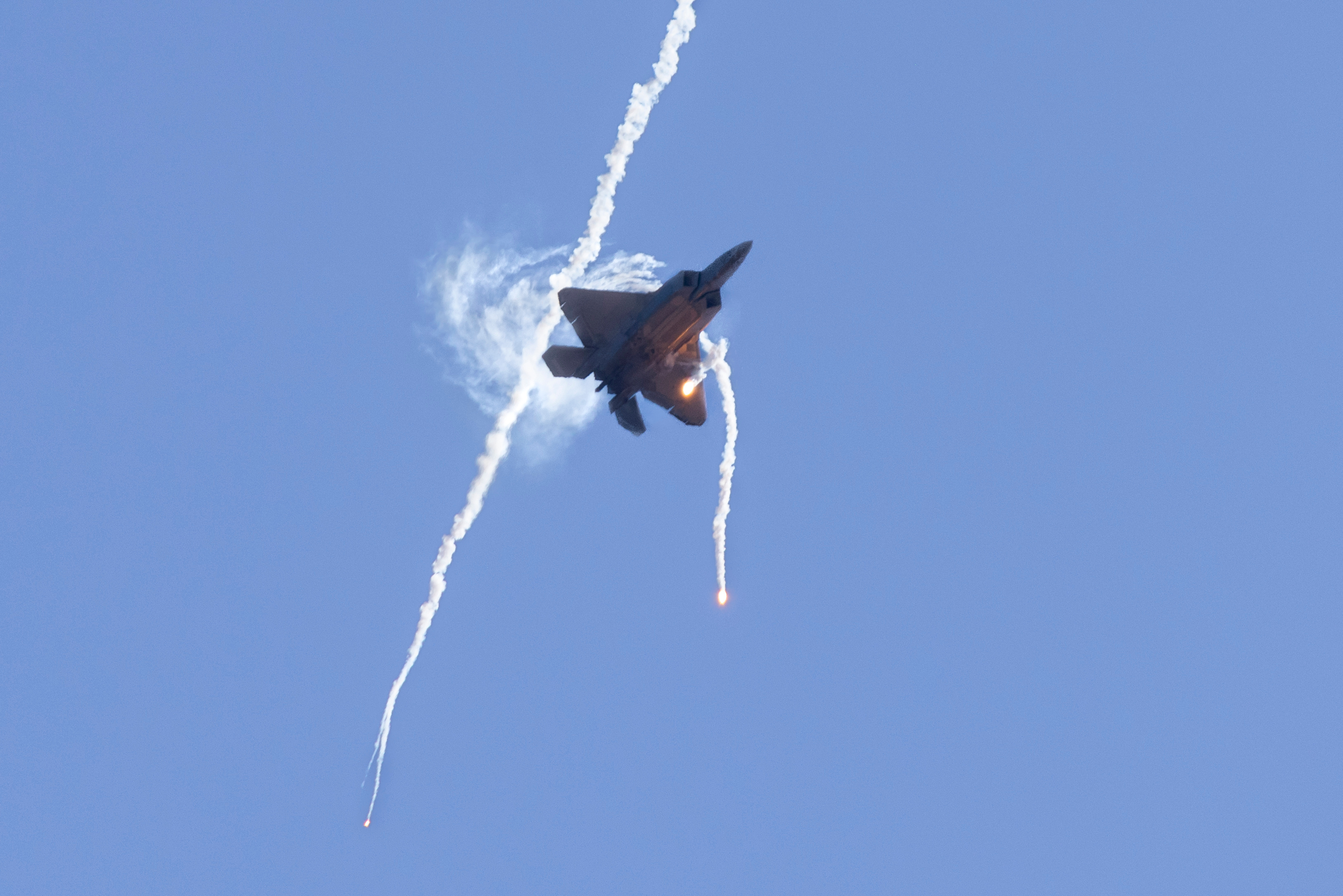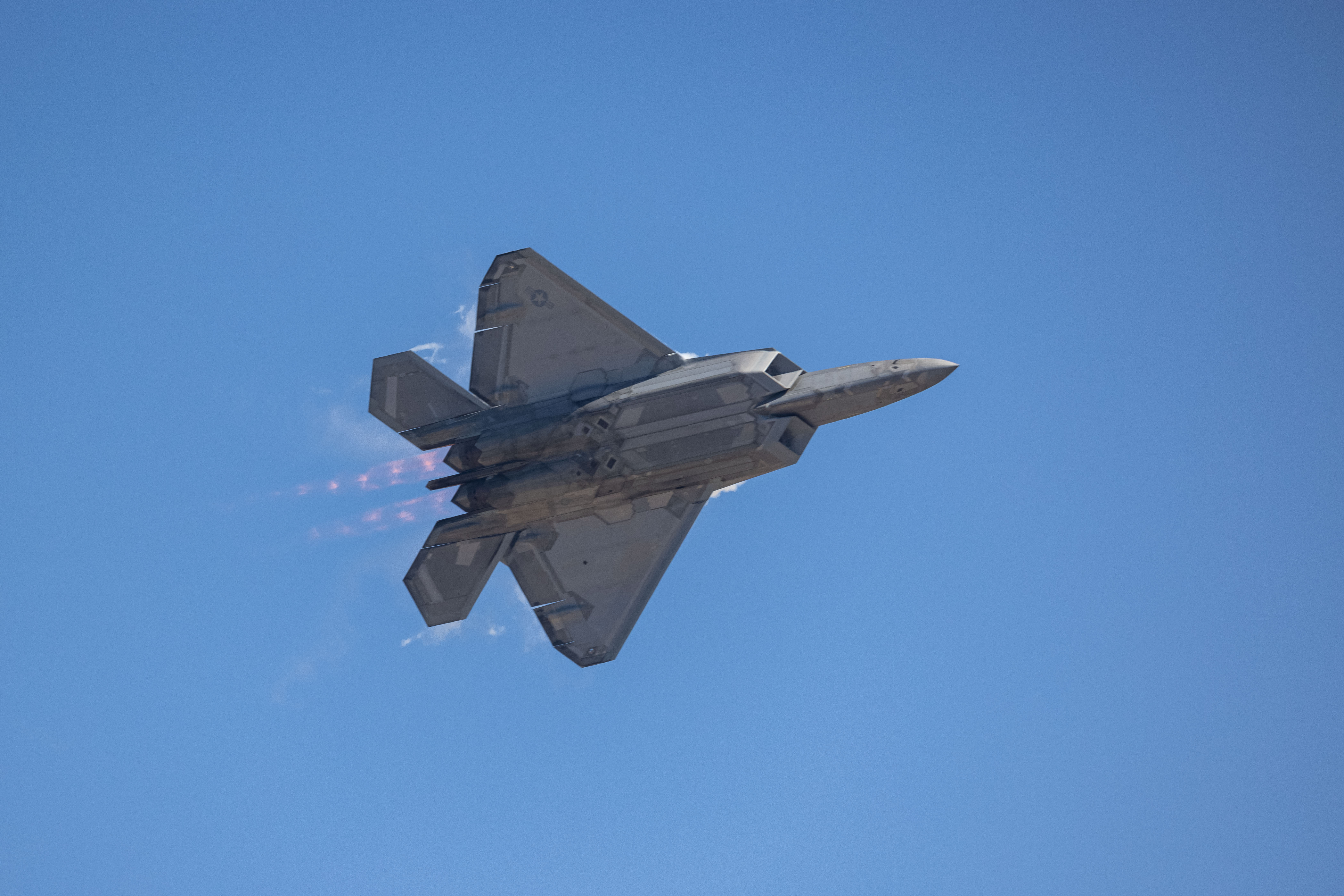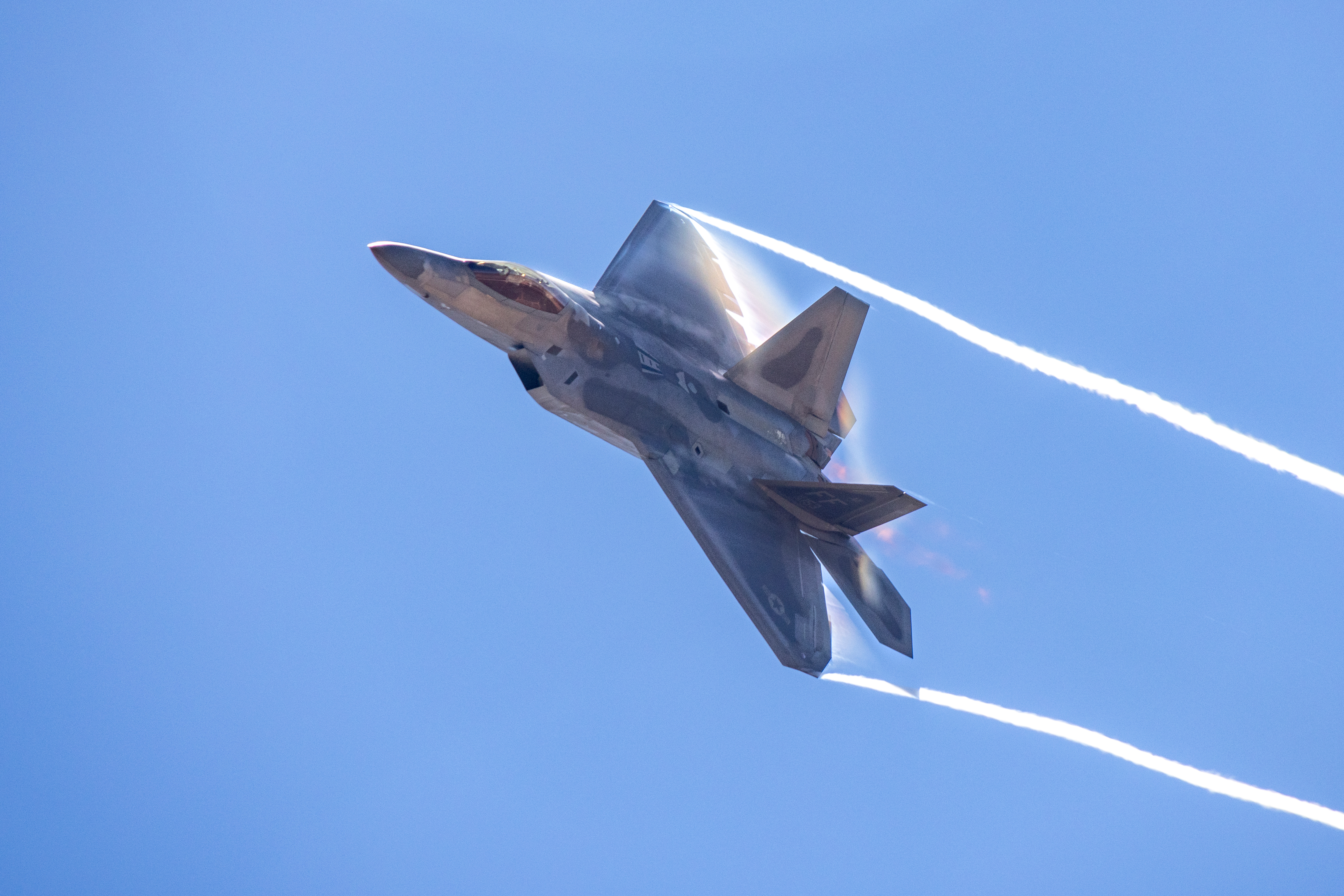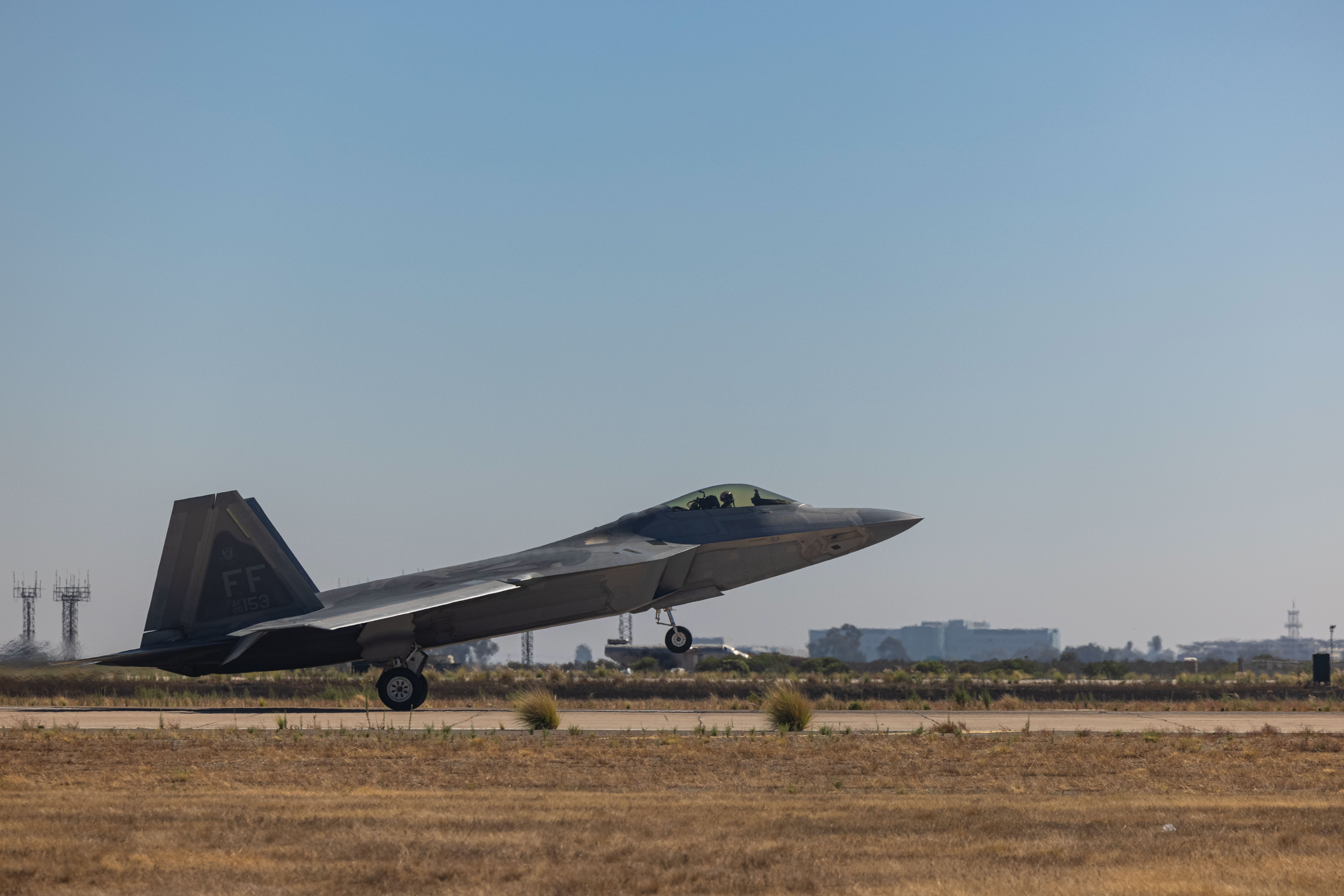 2024 年 9 月 28 日,在圣迭戈举行的 2024 年海军陆战队米拉玛航空站航展上,一架美国空军 F-22 猛禽在飞行线上翱翔。F-22 “猛禽 ”战斗机表演队在世界各地的航展上进行精确的空中机动表演