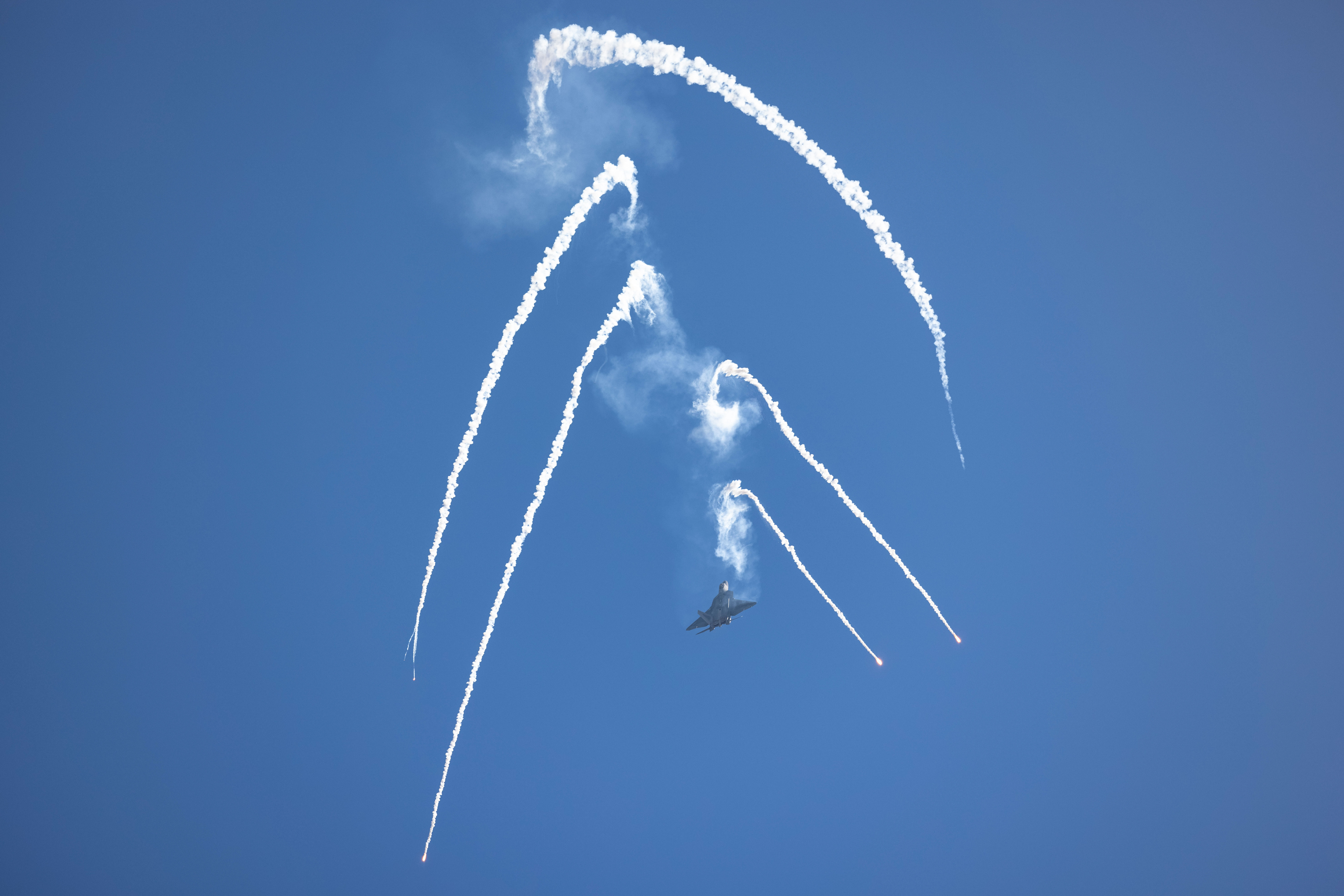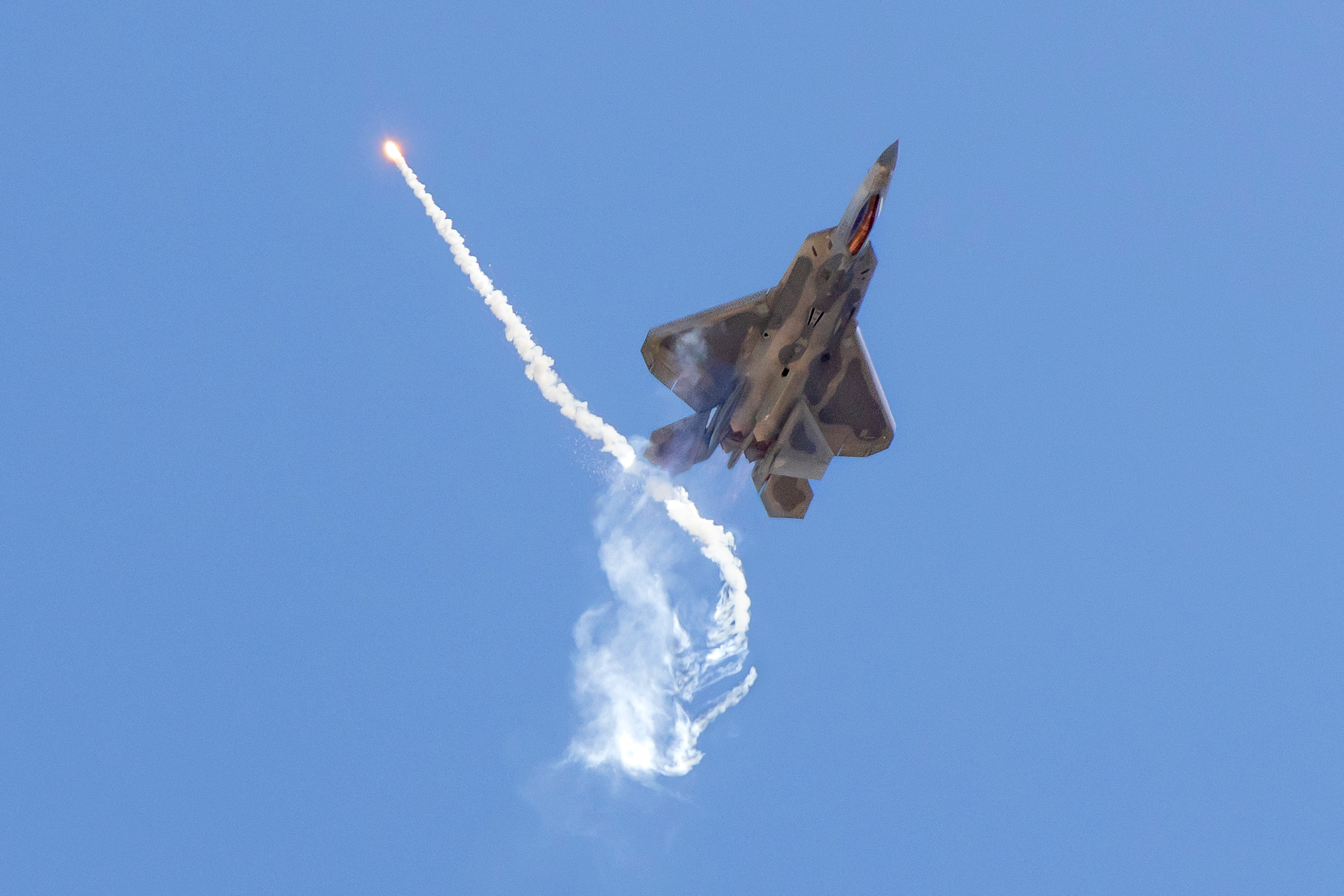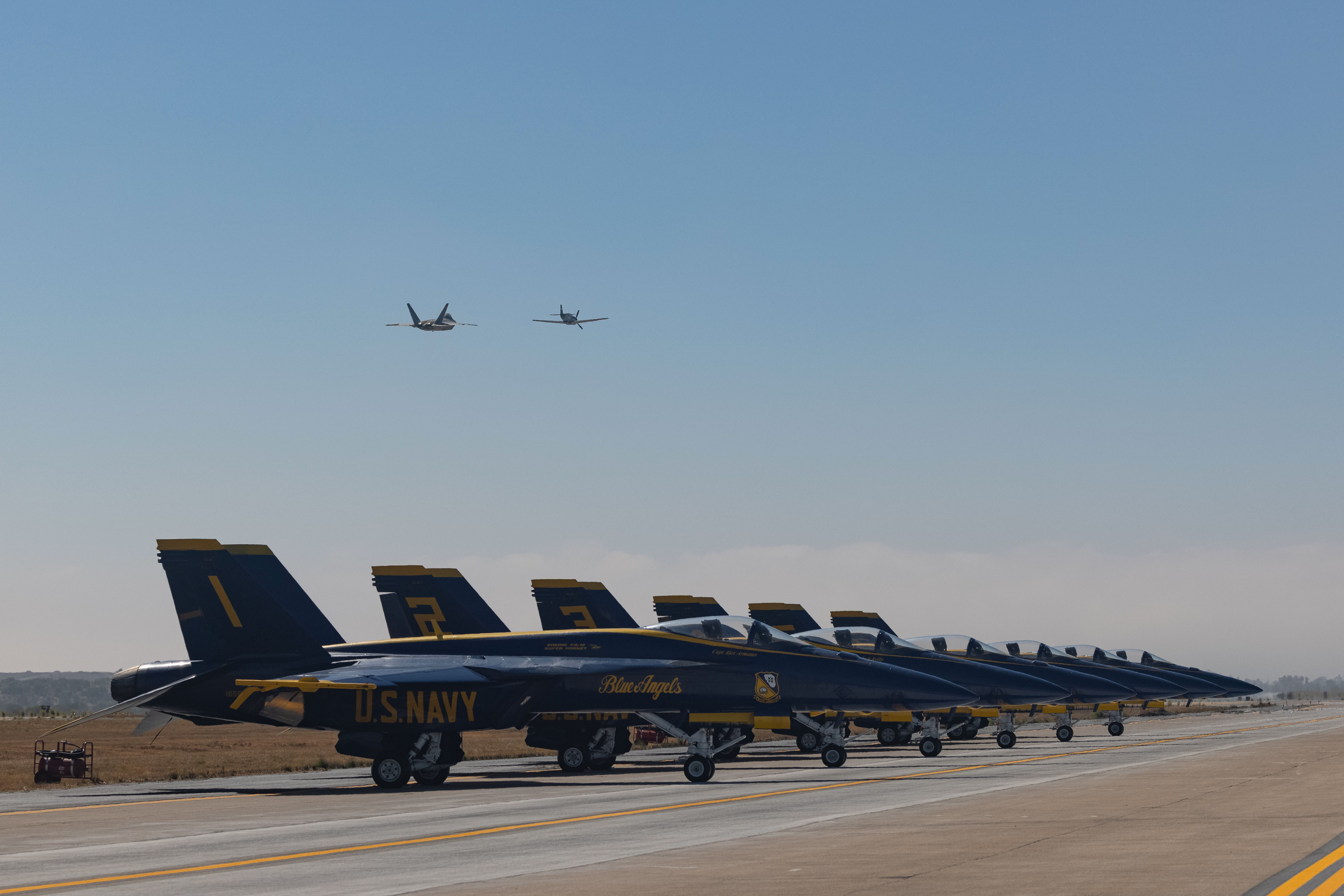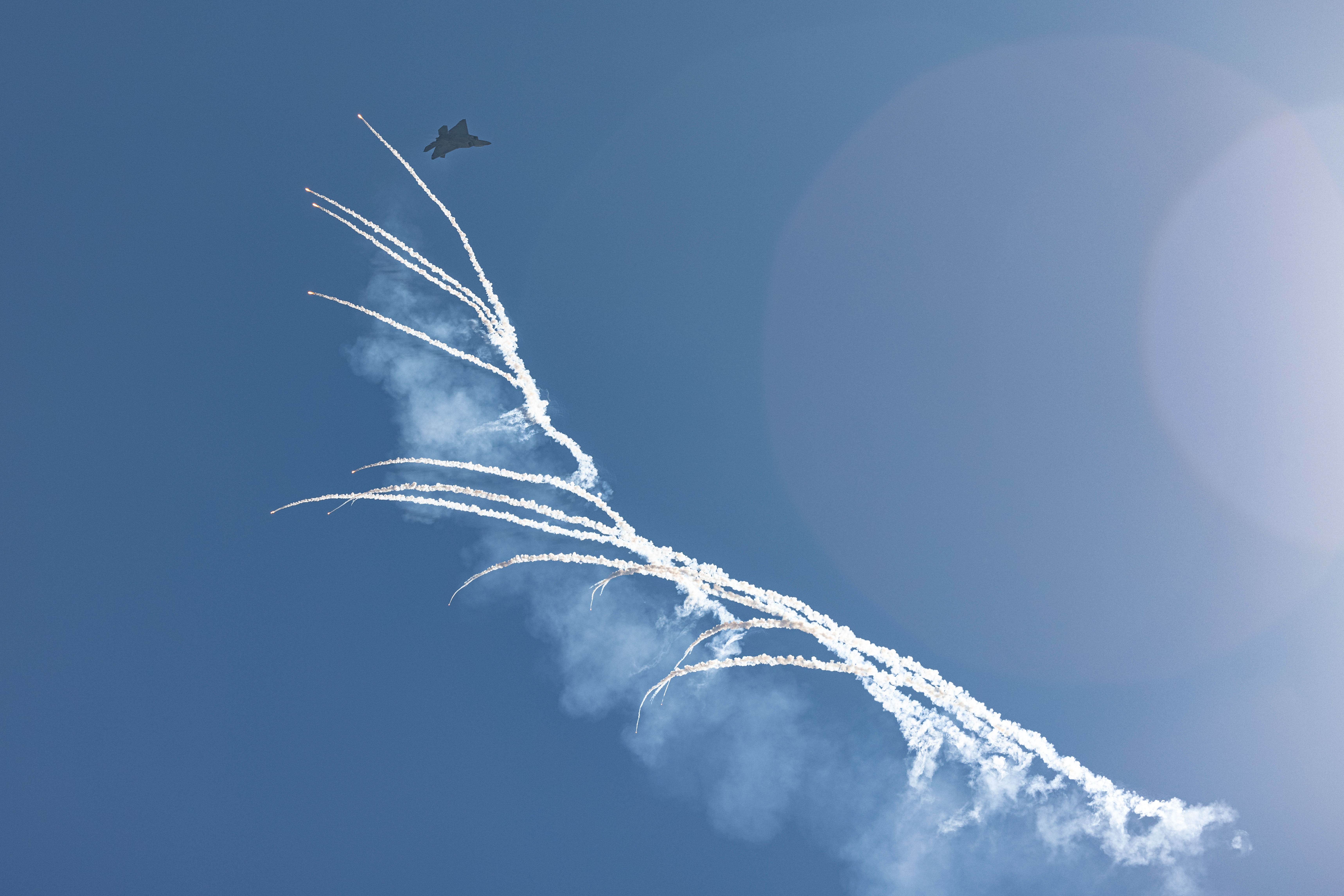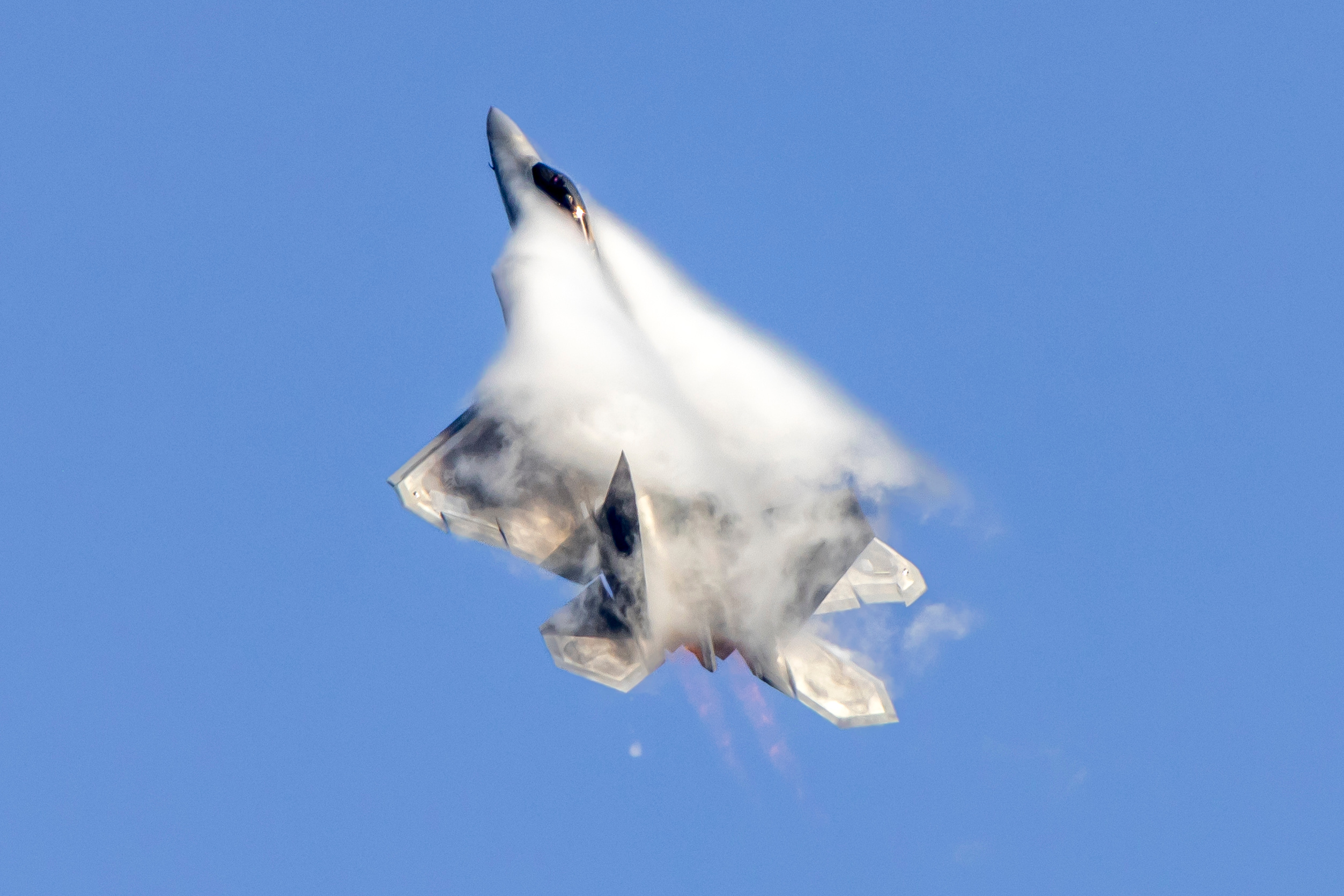 2024 年 9 月 28 日,在圣迭戈举行的 2024 年海军陆战队米拉玛航空站航展上,一架美国空军 F-22 猛禽在飞行线上翱翔。F-22 “猛禽 ”战斗机表演队在世界各地的航展上进行精确的空中机动表演