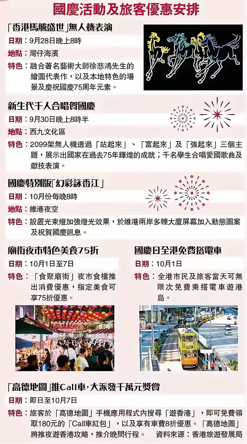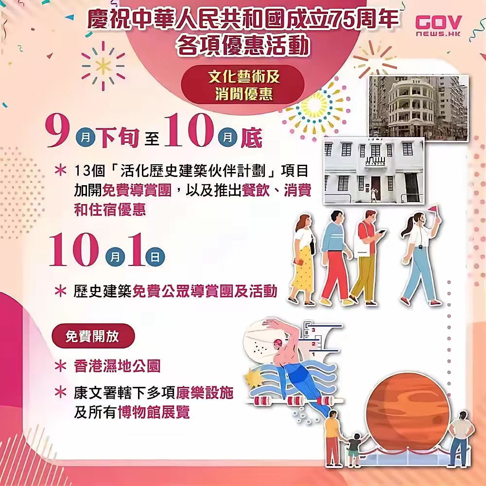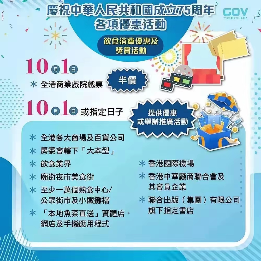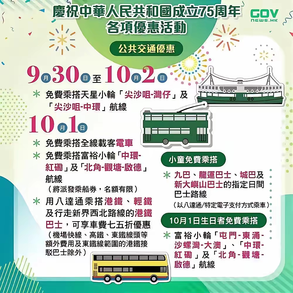 今天國慶75週年,香港好多活動呀,維港還有煙花匯演。當然香港每次都是真金白銀搞活動比如之前每個學生補貼2500教育津貼,還有今天國慶日小童坐巴士免費,天星小輪和叮叮電車都免費,然後很多吃飯的地方和影院也打折,不像內地搞些什麼優惠卷,又麻煩還不實惠,都是虛頭巴腦的。要給香港政府點個讚!