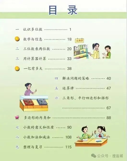 2026年春学期苏教版四年级下册数学教材的目录如下: