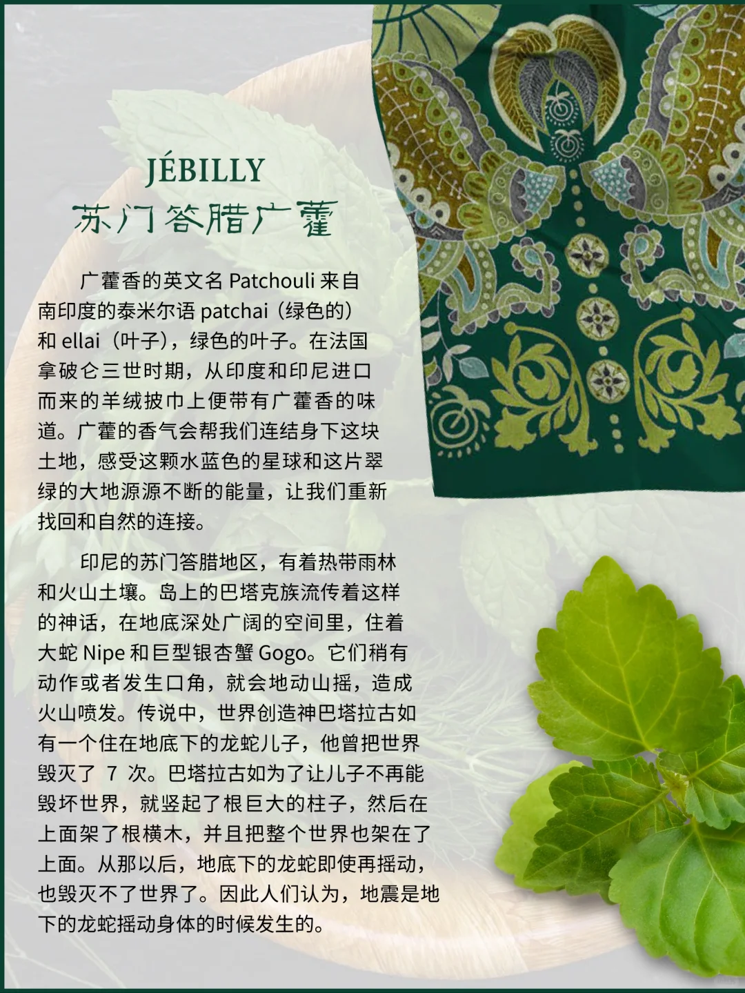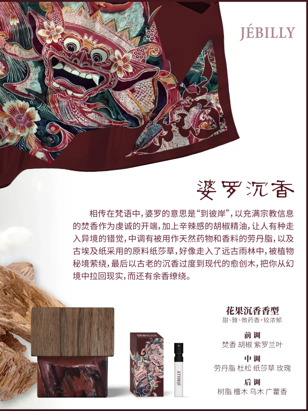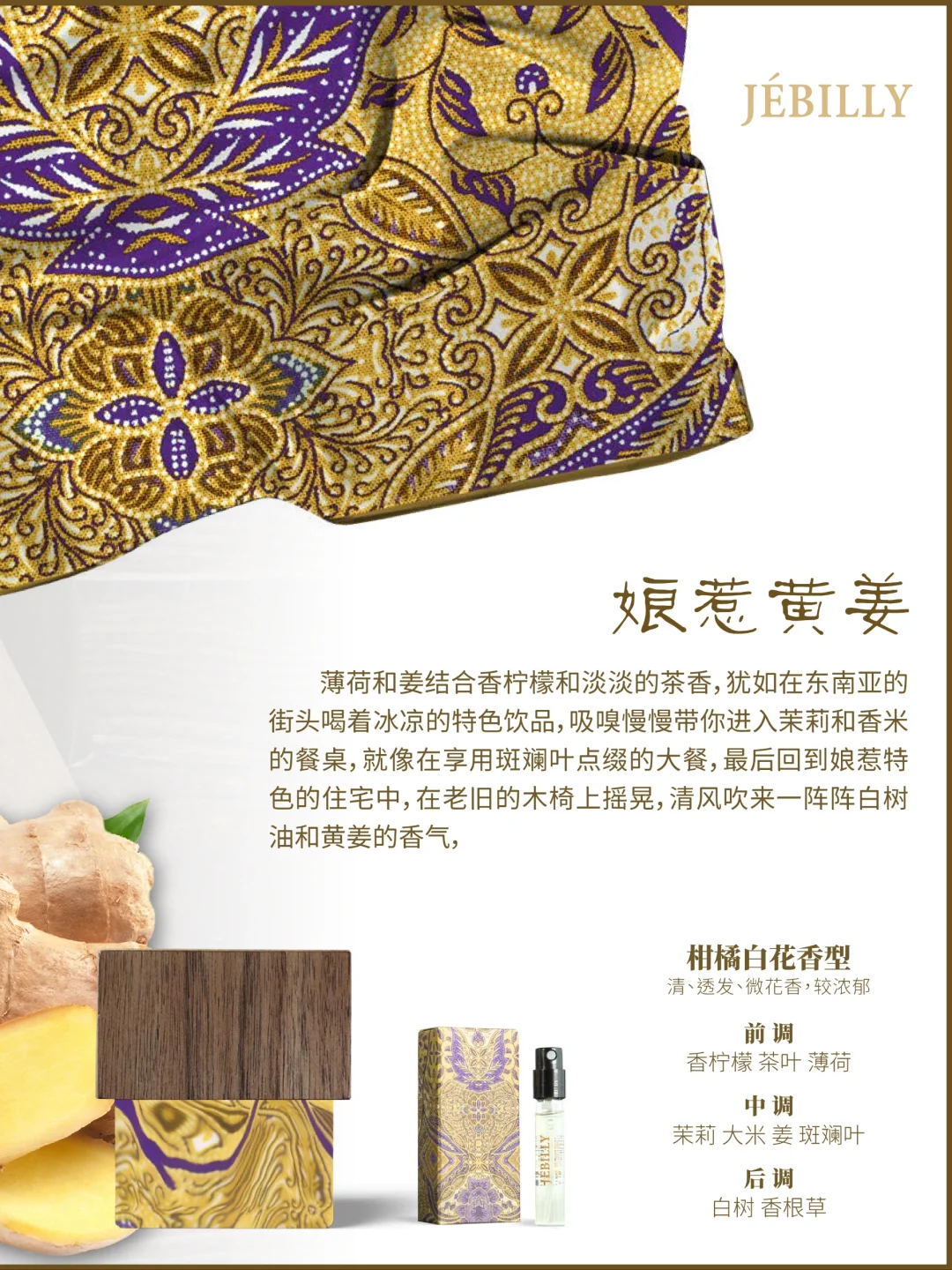🌳🍋☘️ 2011年成立的 JEBILLY 香水品牌,名字源自于创始人Surah Tan先生外婆的姓氏Jebilly,以印尼的历史地理及香料文化特色,结合创始人在华的多年香水行业从事经验,推出了“婆罗沉香”、“娘惹黄姜”、“苏门答腊广藿”三款香水,后续也还会以印尼当地具有传奇色彩的故事继续推出更多香气,例如:戛丁街二号、天空之门、恶魔的眼泪。其中大量用到了印尼特*有的丁香、肉豆蔻、黑胡椒、茶、可可和咖啡、安息香、沉香、广藿、檀香。