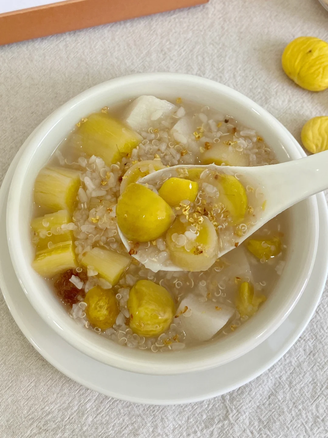 木薯100g+山药100g+桃胶10g+板栗4颗+藜麦20g+冰糖适量+桂花适量