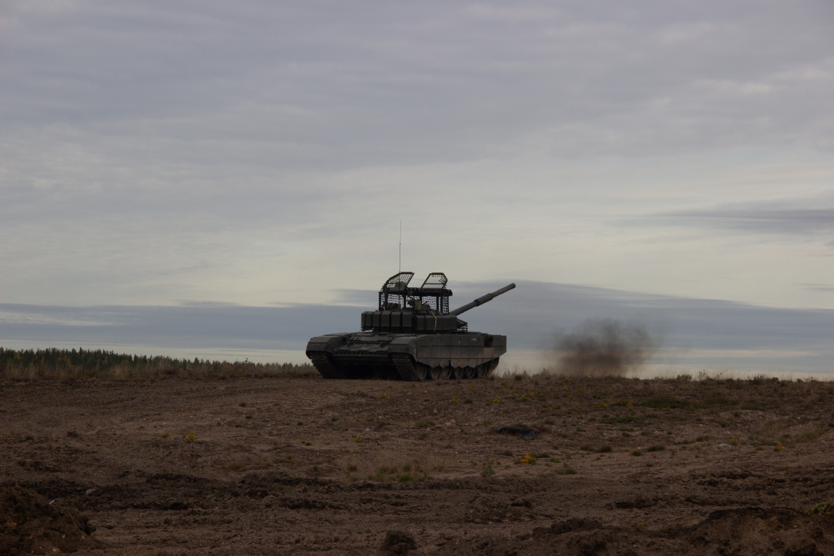 在列宁格勒地区的一个军事训练场上,俄坦克部队的乘员在行进中提高射击技能。在训练过程中,来自列宁格勒军区(Leningrad Military District)的教官向合同军人传授特别军事行动(SMO)的实战经验。