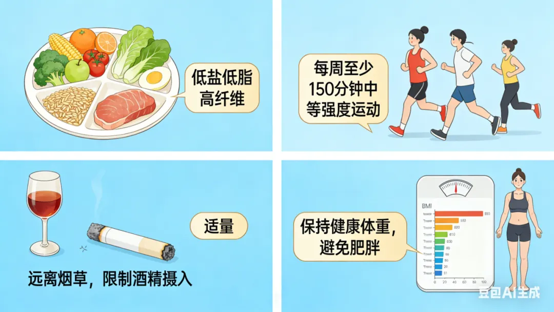合理饮食:低盐、低脂、低糖,多摄入蔬菜水果和全谷物