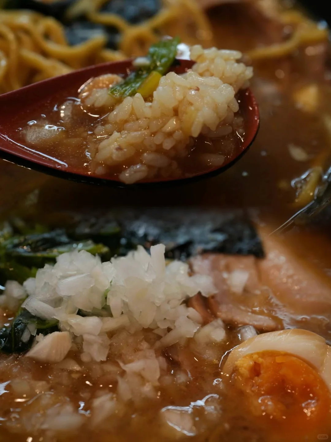 吉村家作为家系鼻祖,汤底几乎要阻挠我夹起拉面的步伐,浓稠的鸡油像化作实质攻陷大脑。叉烧肥而不腻,配上单独买的葱丝或洋葱碎大口吃掉。更恐怖的吃法是拉面汤泡饭,能衬托出更多属于猪骨的肥浓和鸡油黄澄澄的厚重。