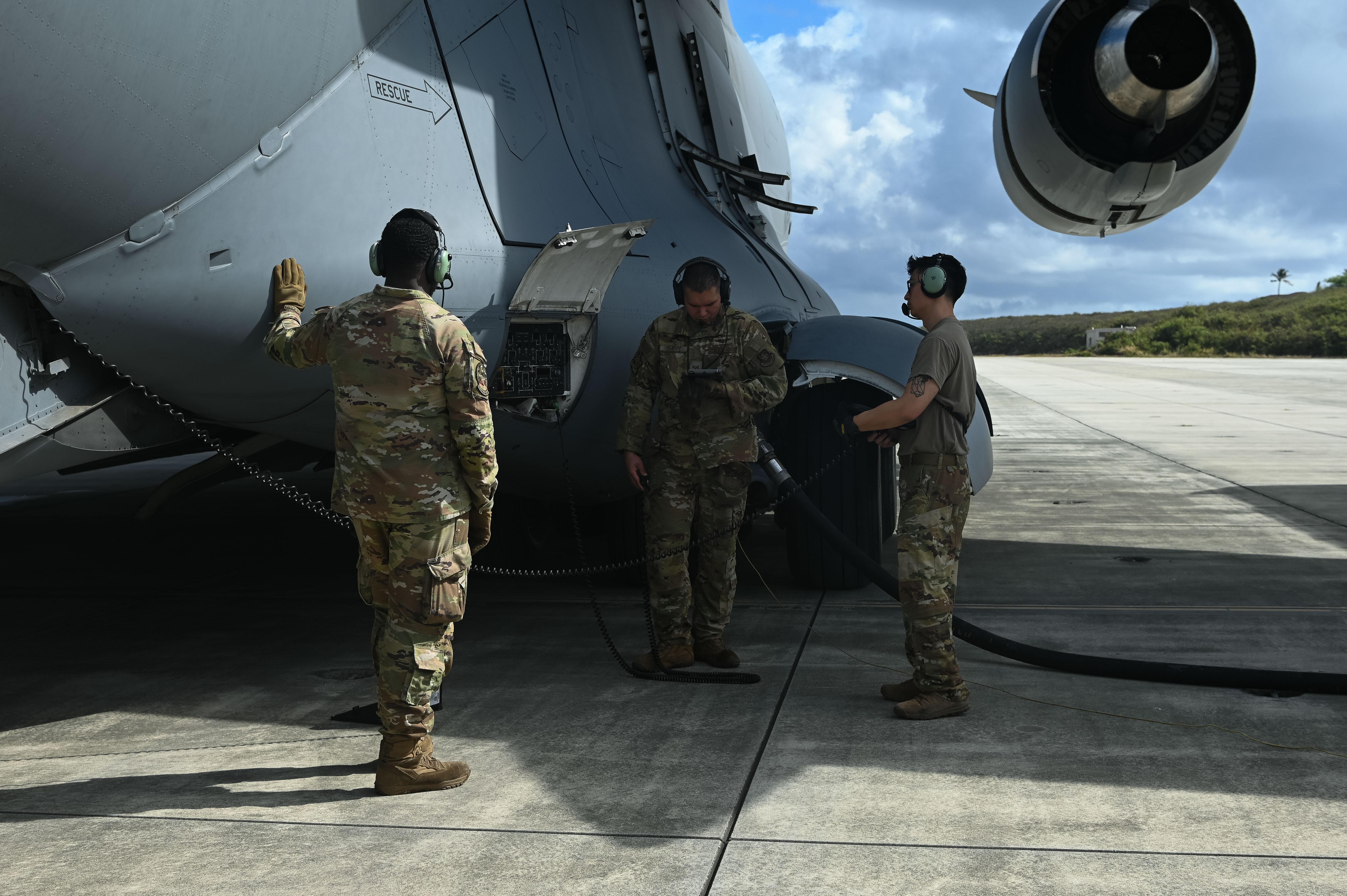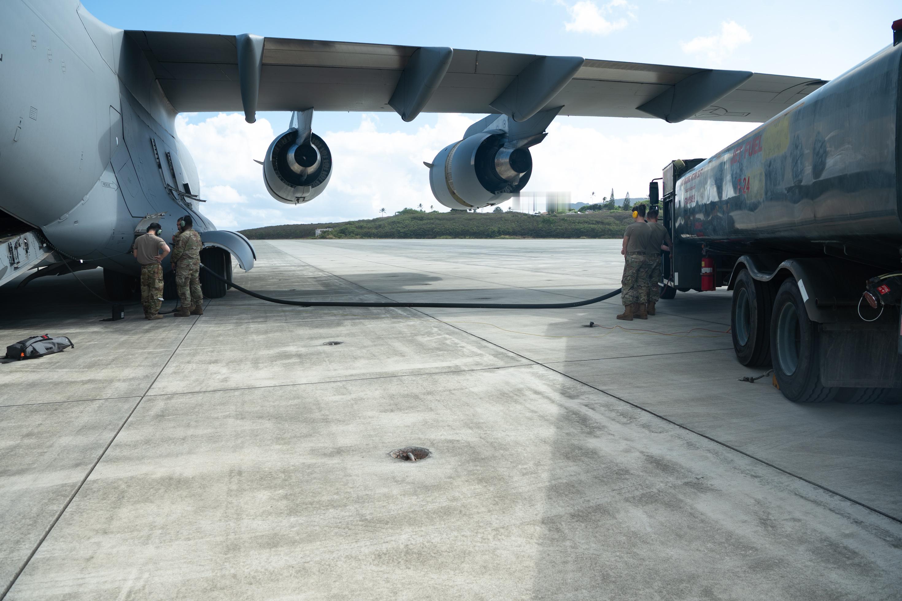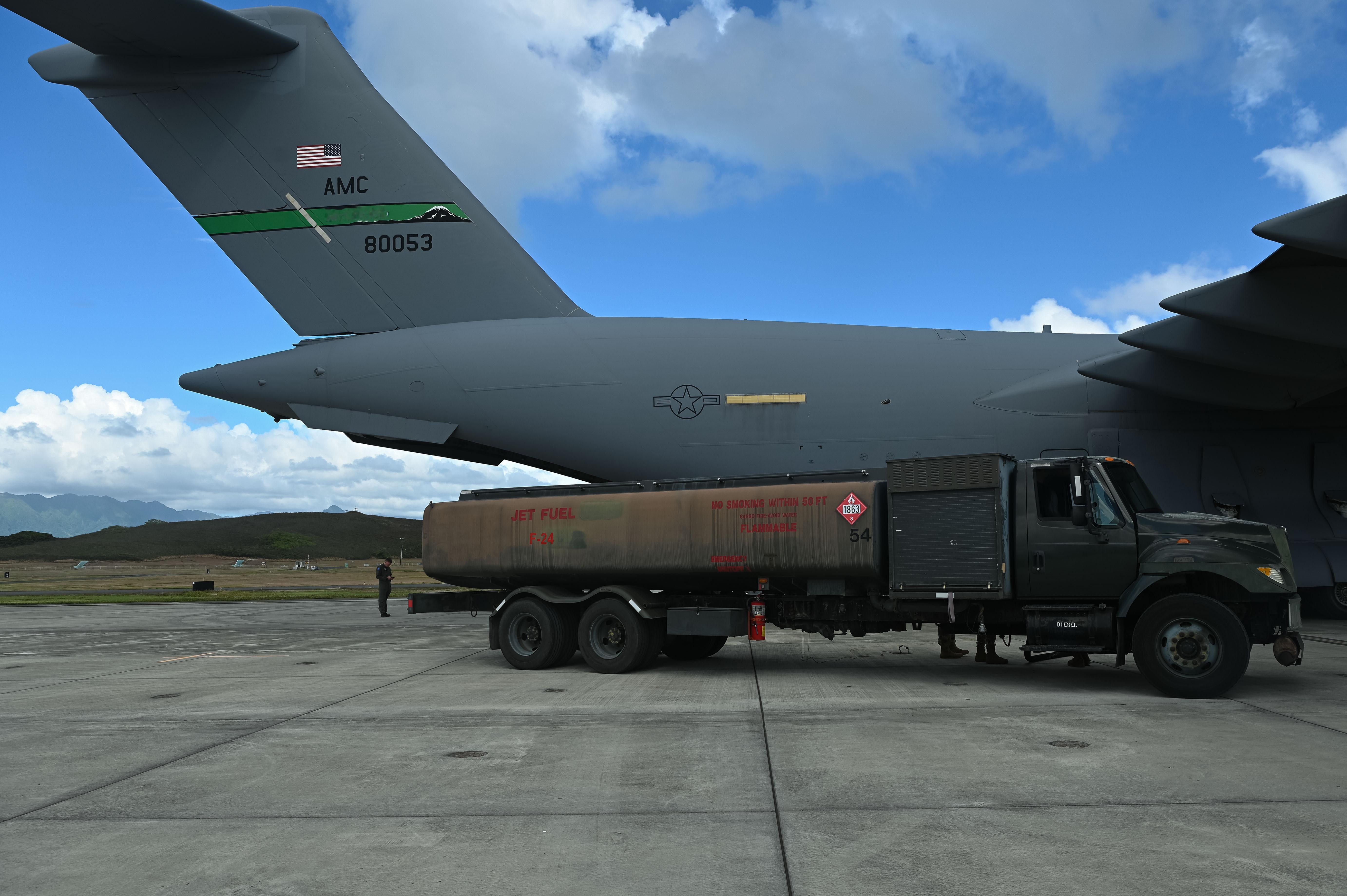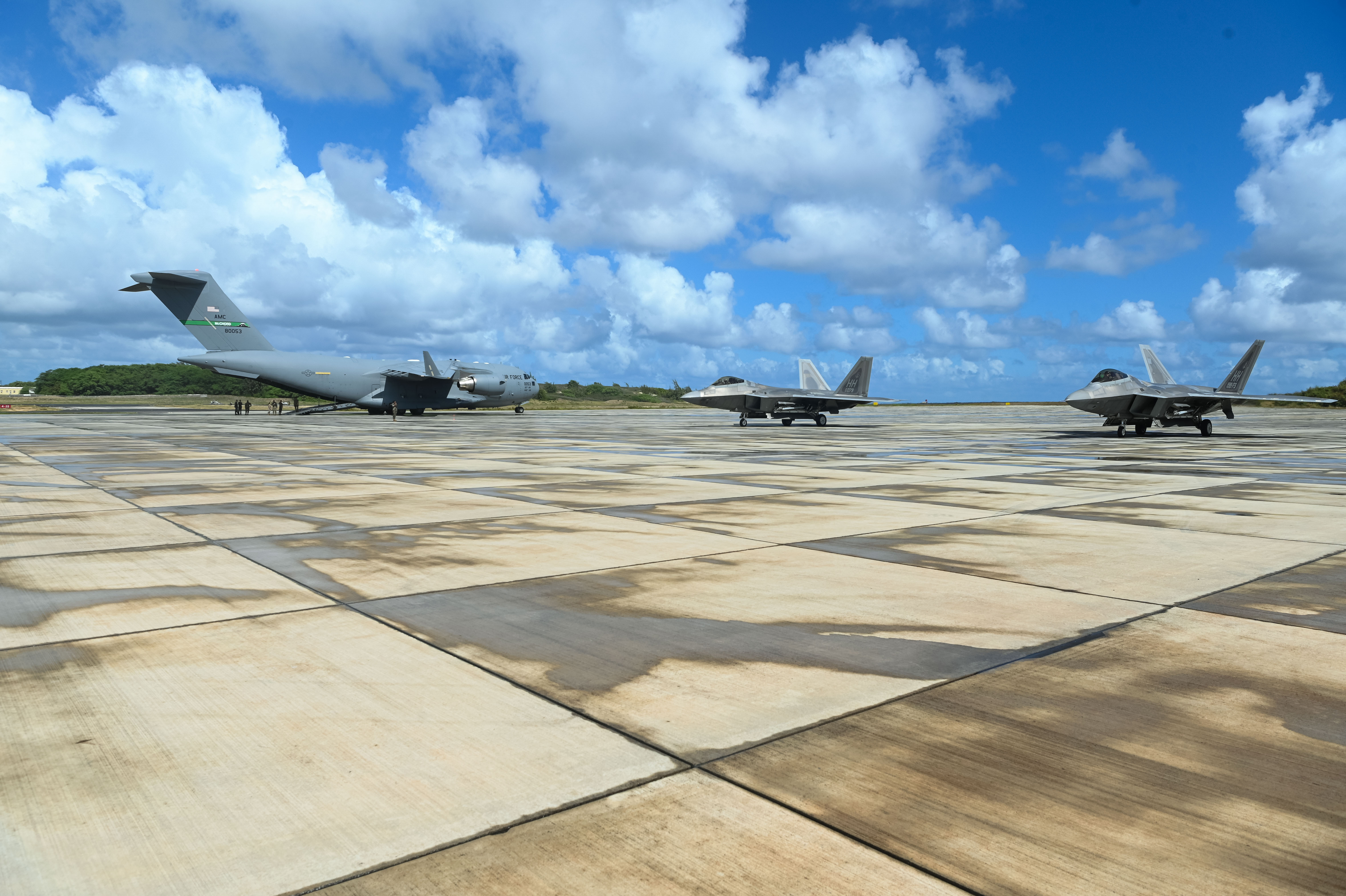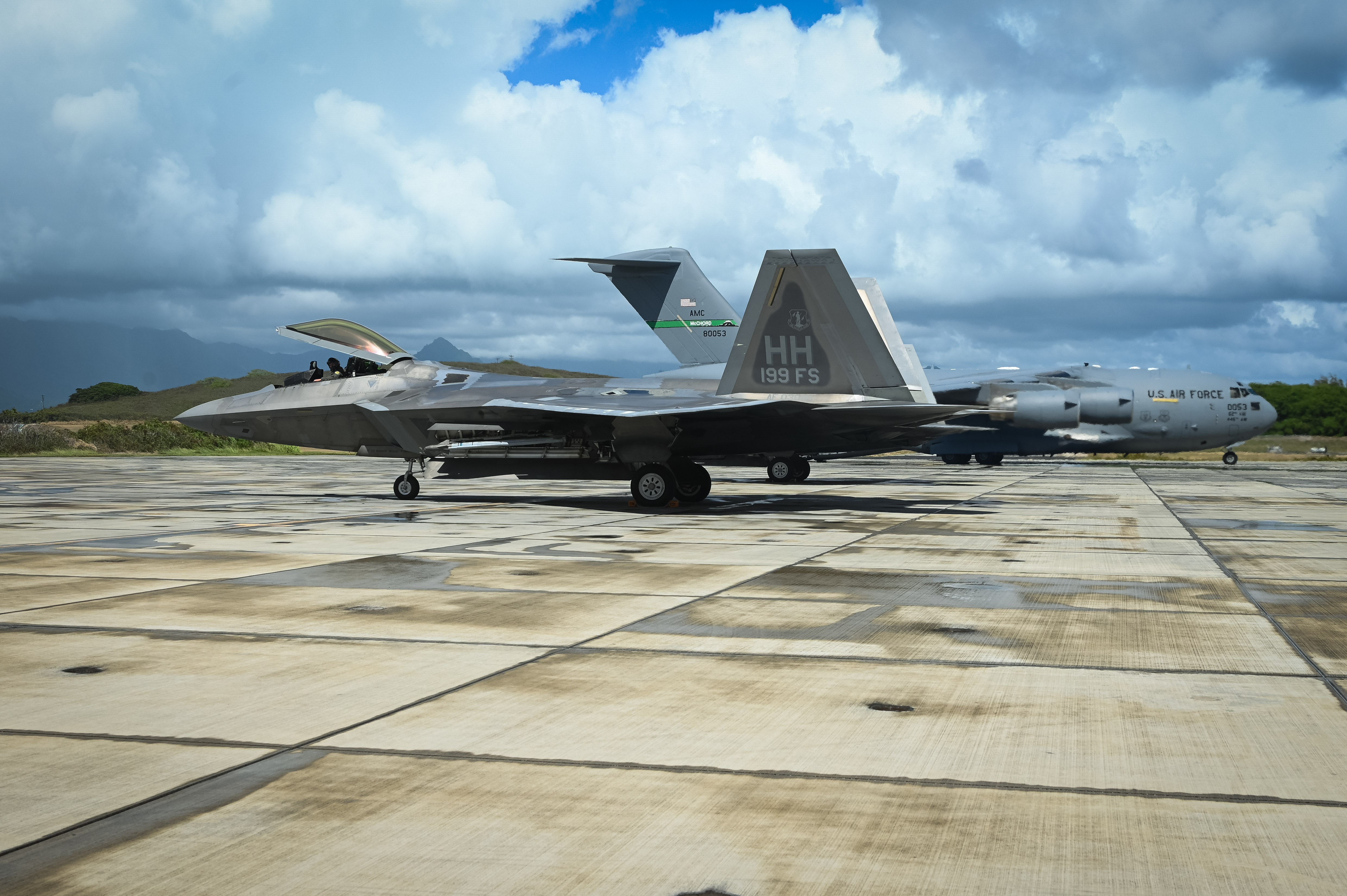 2024年10月9日,在 “雷尼尔战争25A ”演习中,来自刘易斯-麦克乔德联合基地的一架美国空军C-17 “环球霸王III ”运输机和来自希卡姆空军基地的F-22 “猛禽 ”战斗机停在夏威夷海军陆战队基地的飞行跑道上。该演习汇集了各种航空资产,以加强美军在印度洋-太平洋地区的联合行动和互操作性。#烽火问鼎计划#