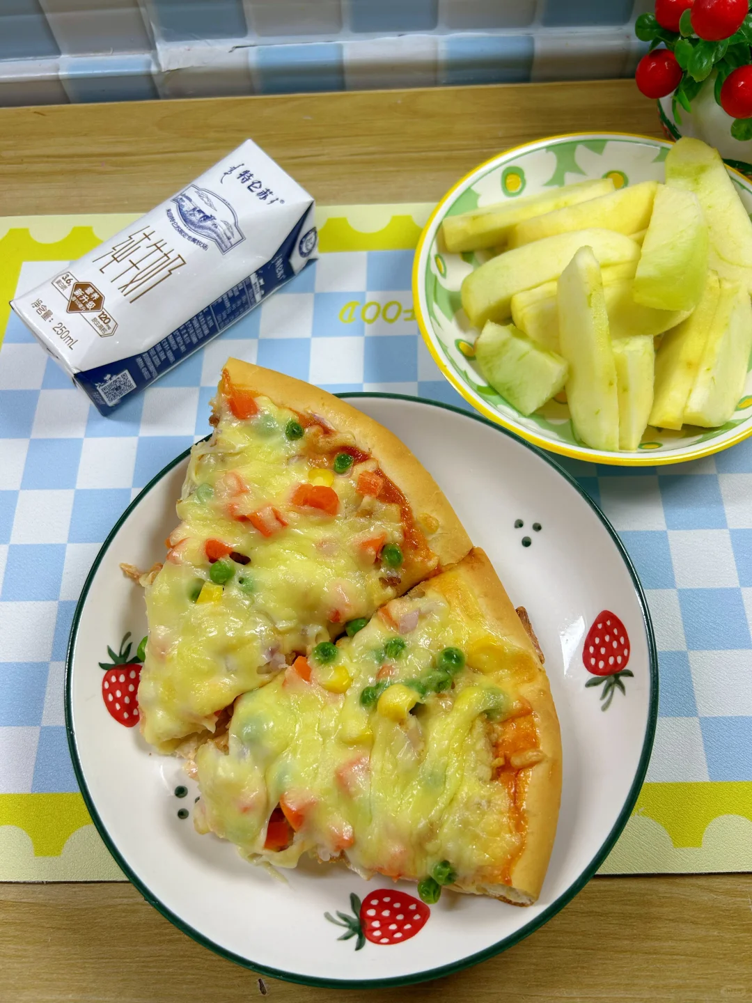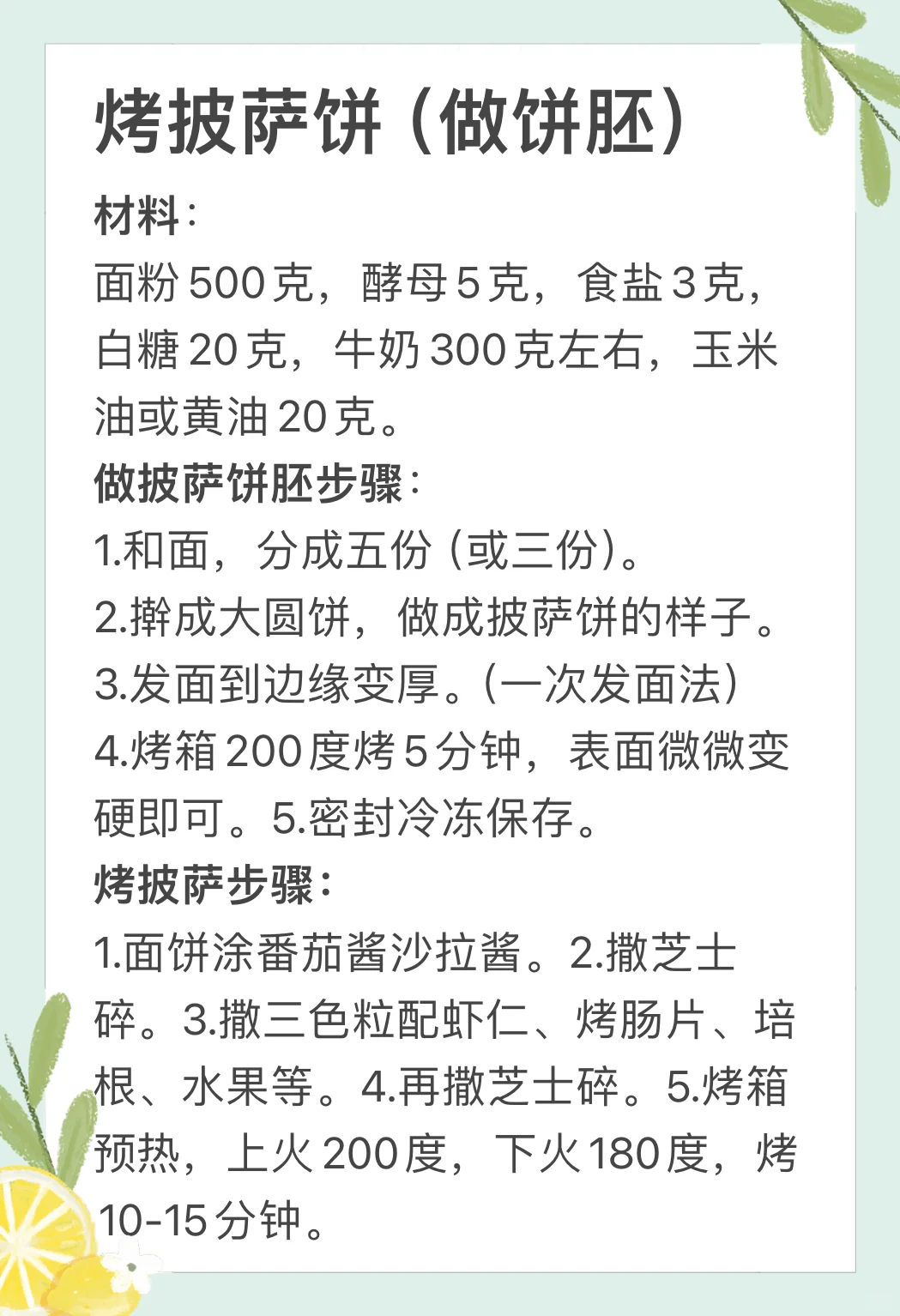 晚上揉好面,擀好披萨饼,发面一会儿再放冰箱冷藏起来,早上起来烤披萨。或者周末做好披萨饼冻起来,早上起来加料烤,20分钟时间,一家人的早餐都有了。 材料: 面粉500克,酵母5克,食盐3克,白糖20克,牛奶300克左右,玉米油或黄油20克。 做披萨饼胚步骤: 1.和面,分成五份(或三份)。 2.擀成大圆饼,做成披萨饼的样子。 3.发面到边缘变厚。(一次发面法) 4.烤箱200度烤5分钟,表面微微变硬即可。5.密封冷冻保存。 烤披萨步骤: 1.面饼涂番茄酱沙拉酱。2.撒芝士碎。3.撒三色粒配虾仁、烤肠片、培根、水果等。4.再撒芝士碎。5.烤箱预热,上火200度,下火180度,烤10-15分钟。
