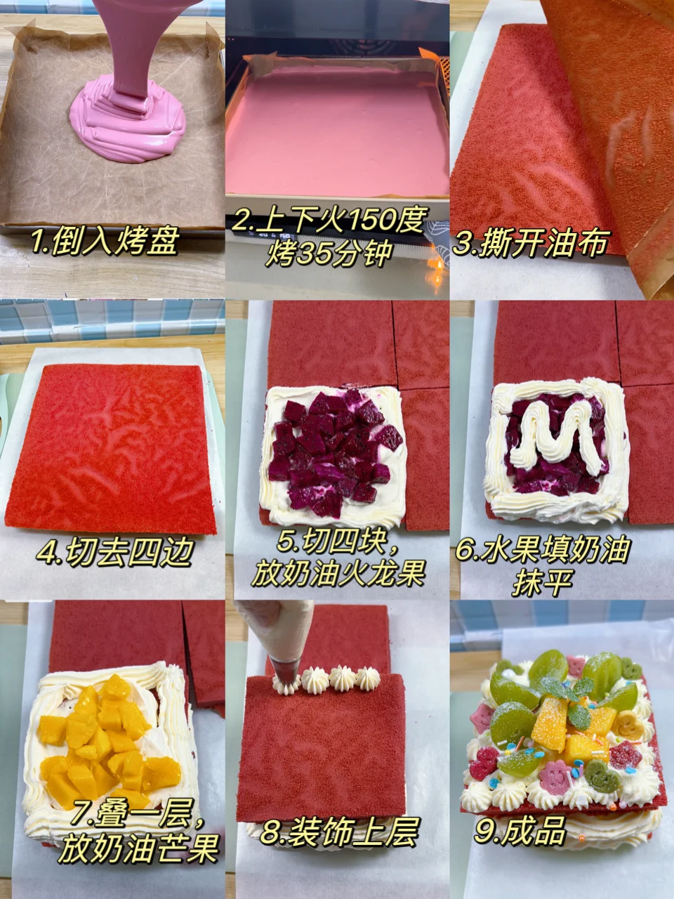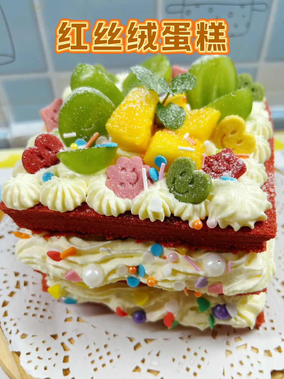 材料: 鸡蛋5个,红丝绒蛋糕预拌粉200克,纯牛奶50克,玉米油50克,淡奶油250毫升,水果适量 步骤: 1.鸡蛋(不用分离蛋清蛋黄)、牛奶、预拌粉混合,搅拌均匀,用300瓦片状电动打蛋器,高速打发6-8分钟,变成粉色面糊。 2.加50克玉米油,低速搅拌均匀。 3.倒入烤盘,上下火150度烤35分钟,或者160度烤30分钟。(40升烤箱) 4.切块,加上奶油和水果做夹心,再用水果和奶油装饰。 随便怎么做都好看的红丝绒裸蛋糕,需要注意的是打蛋器功率要够,我用的是300瓦电动打蛋器,打蛋器如果太小了,打发面糊会困难。